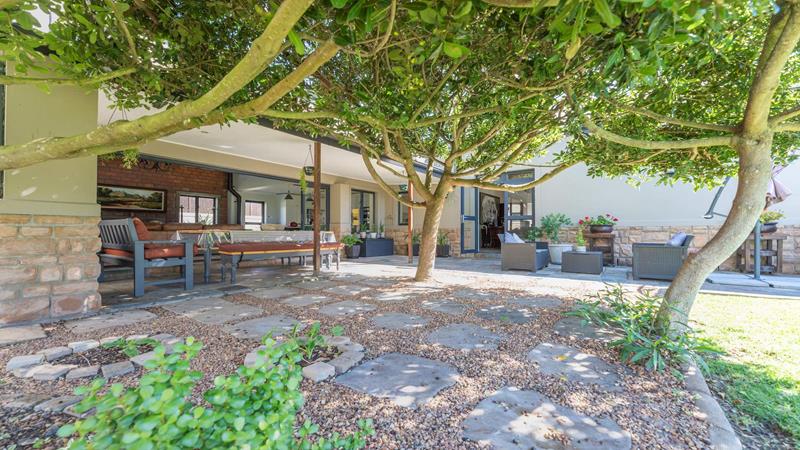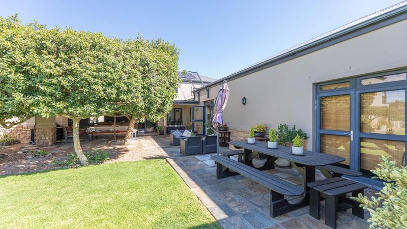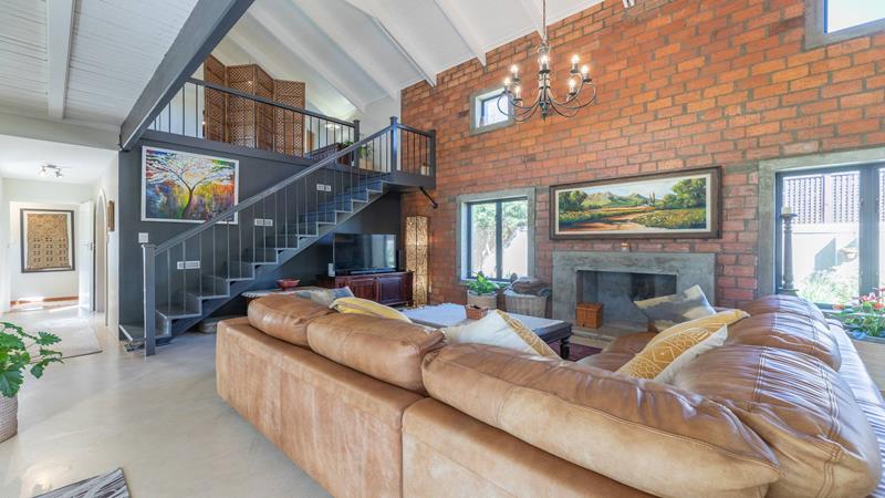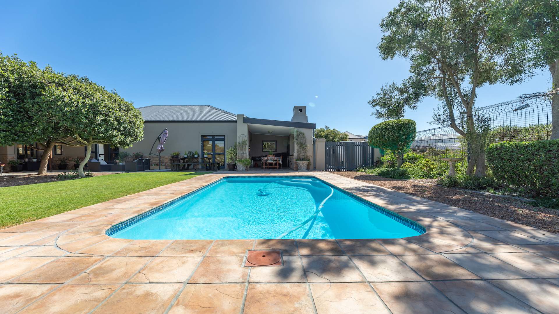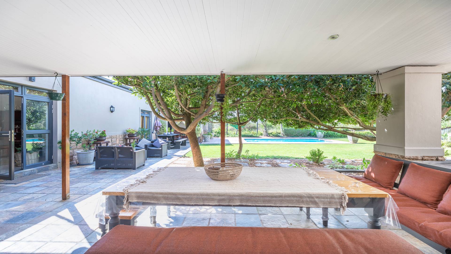 The outdoor space is equally impressive, featuring a large pool and a covered braai area, ideal for enjoying the beautiful surroundings and entertaining guests.