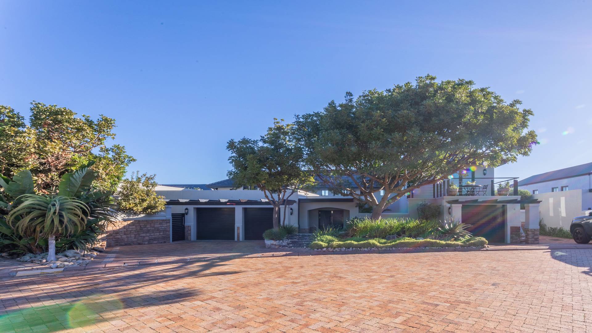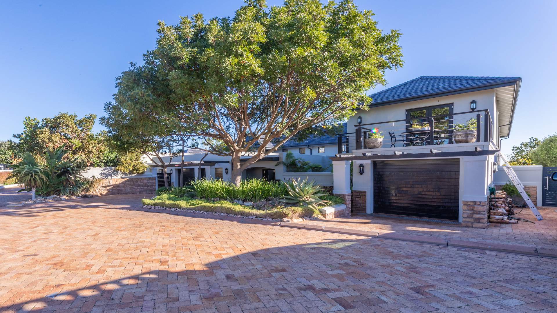 - Three spacious automated garages equipped with a workbench area.