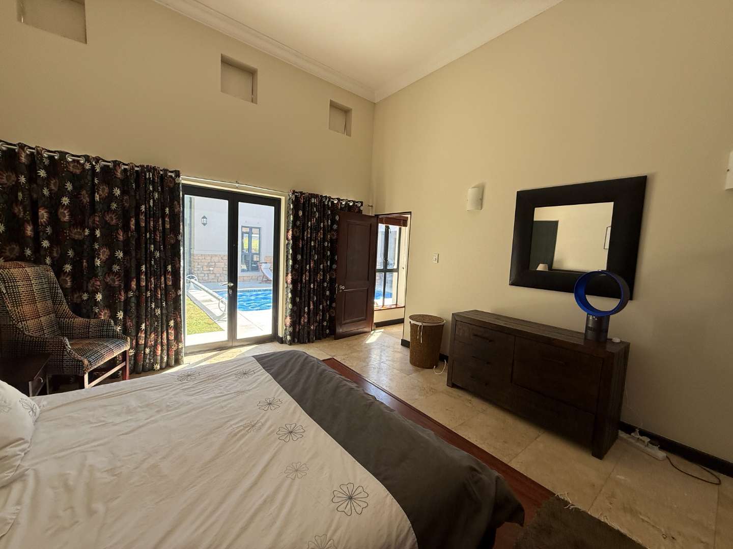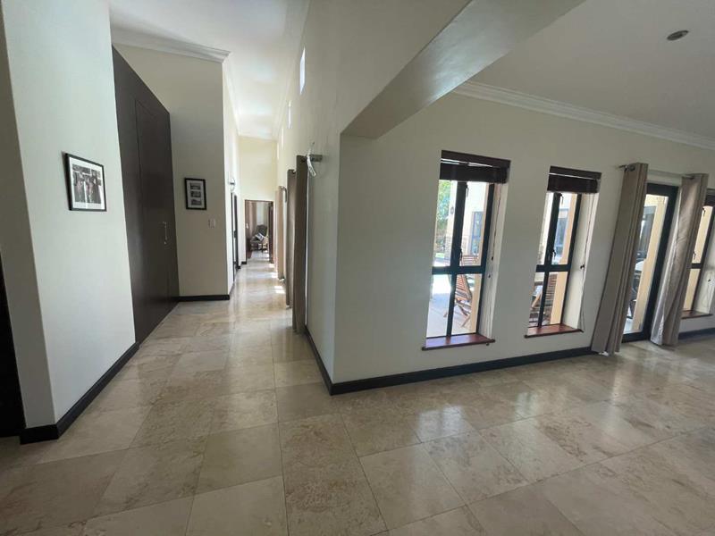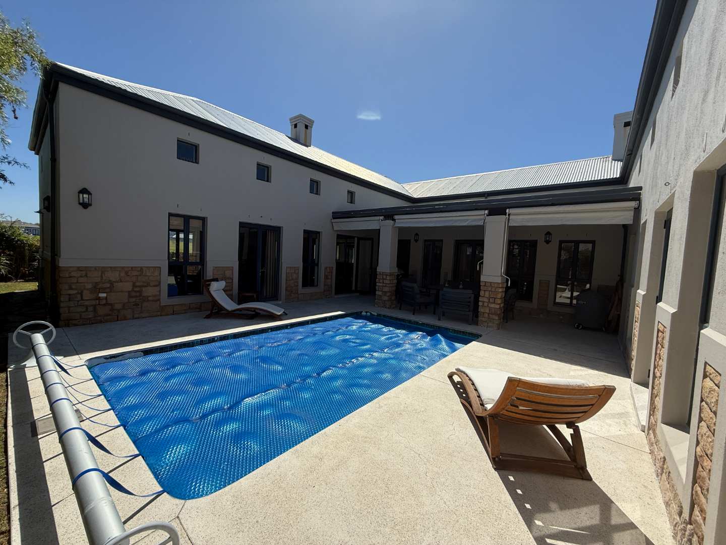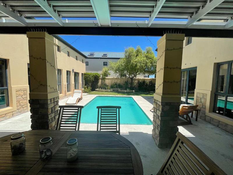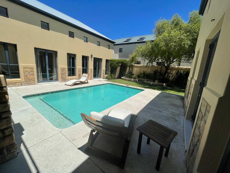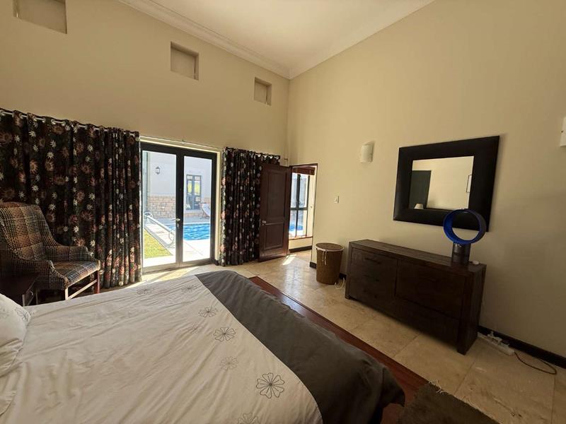 The home features three spacious en-suite bedrooms, each providing privacy and ample space. High ceilings throughout the property create an open and airy atmosphere, enhancing the sense of space and light. The U-shaped design of the home includes a stunning swimming pool, perfect for leisurely afternoons or entertaining guests. The covered stoep, equipped with weather blinds, allows for year-round enjoyment of the outdoor areas. Additionally, the property boasts a borehole and automated irrigation system, ensuring lush and well-maintained gardens without effort.