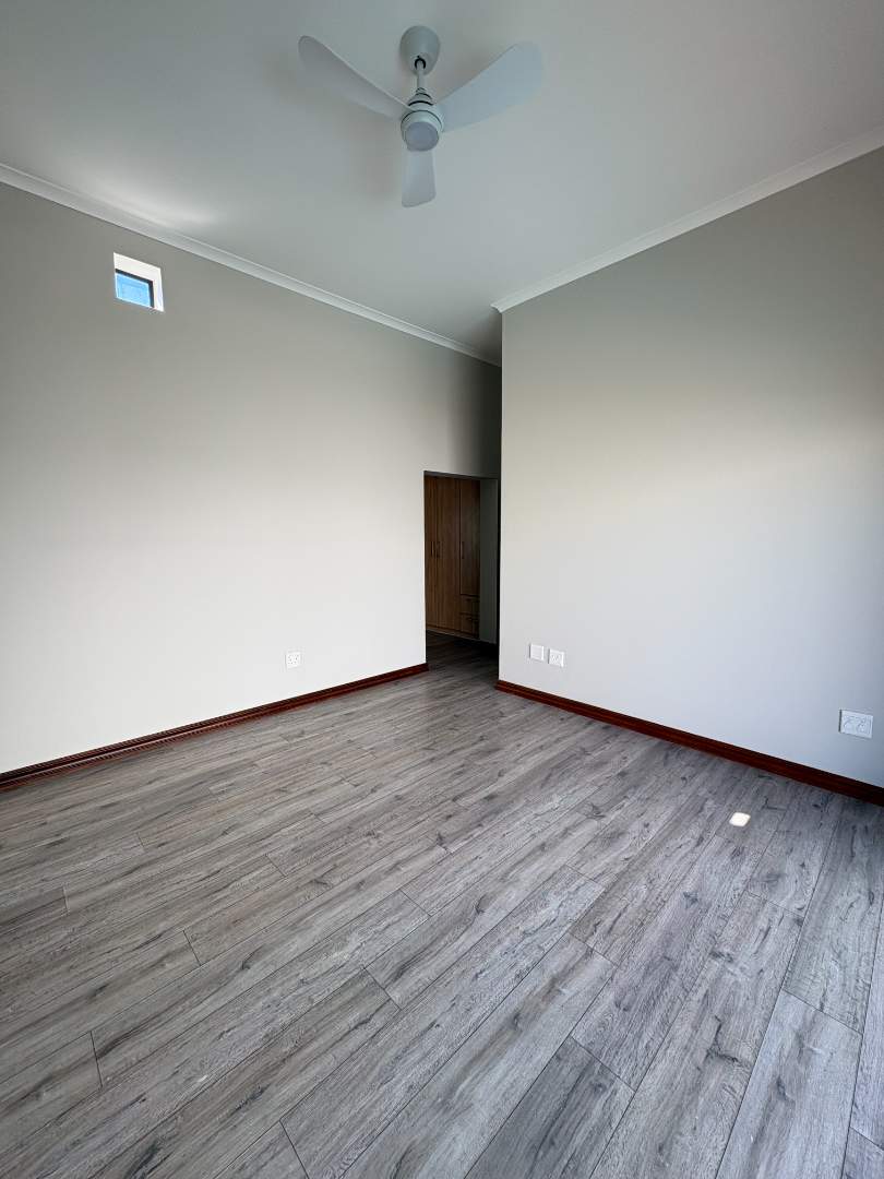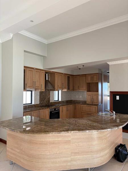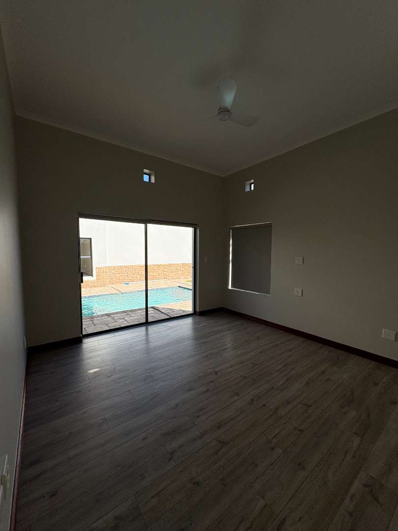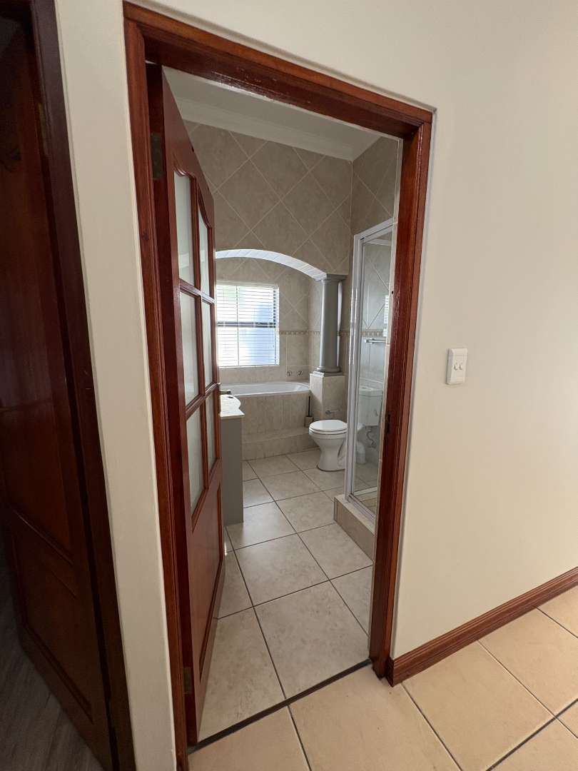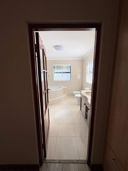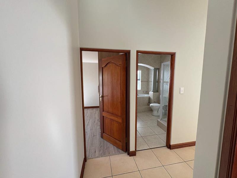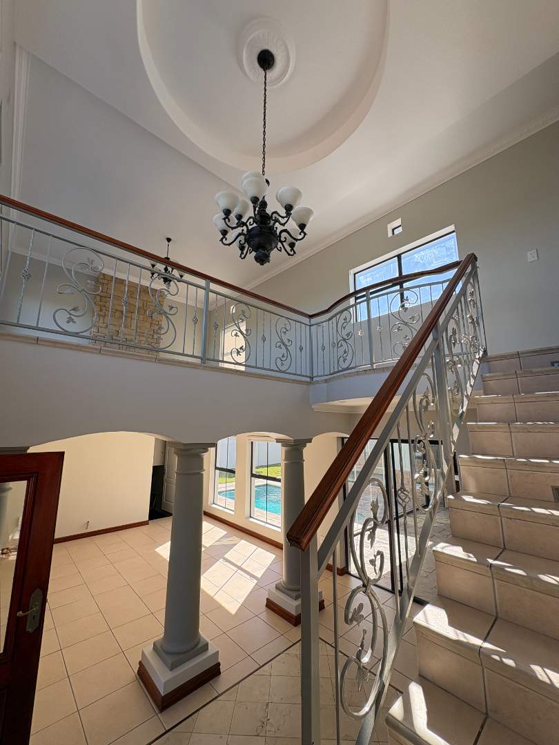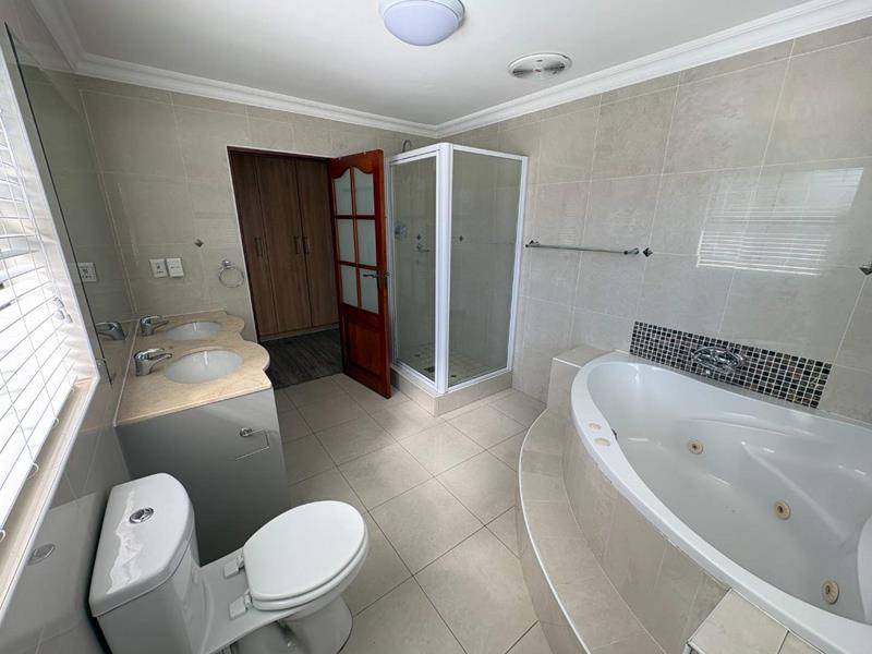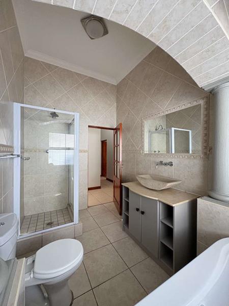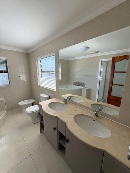 The ground floor offers three spacious bedrooms and two modern bathrooms, including a main suite with direct access to the lush back garden and pool area. For those who work from home, there is a dedicated office space with ample built-in cupboards. The heart of the home is the open plan lounge, dining, and kitchen area, which includes a separate scullery for added convenience. Additionally, the property features a double automated garage with space for two extra cars.