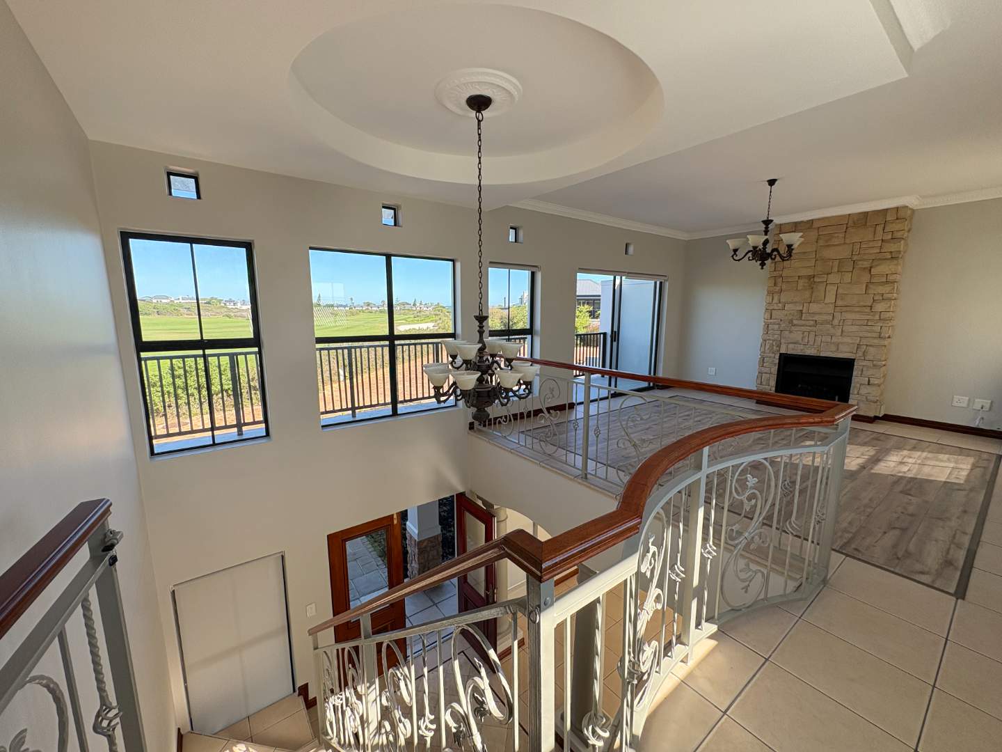 The first floor reveals a cozy lounge area with a gas fireplace, offering breathtaking fairway views and access to a large balcony. An additional en-suite bedroom upstairs provides privacy and comfort for guests or family members.