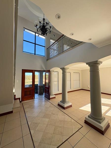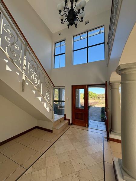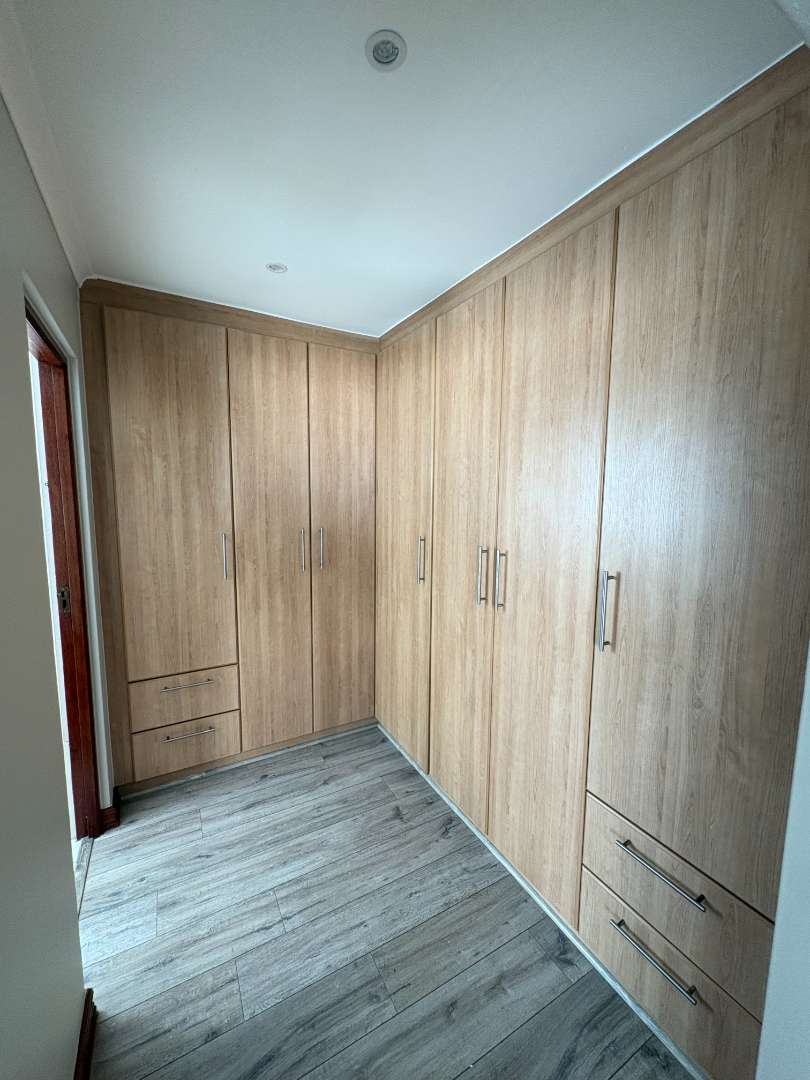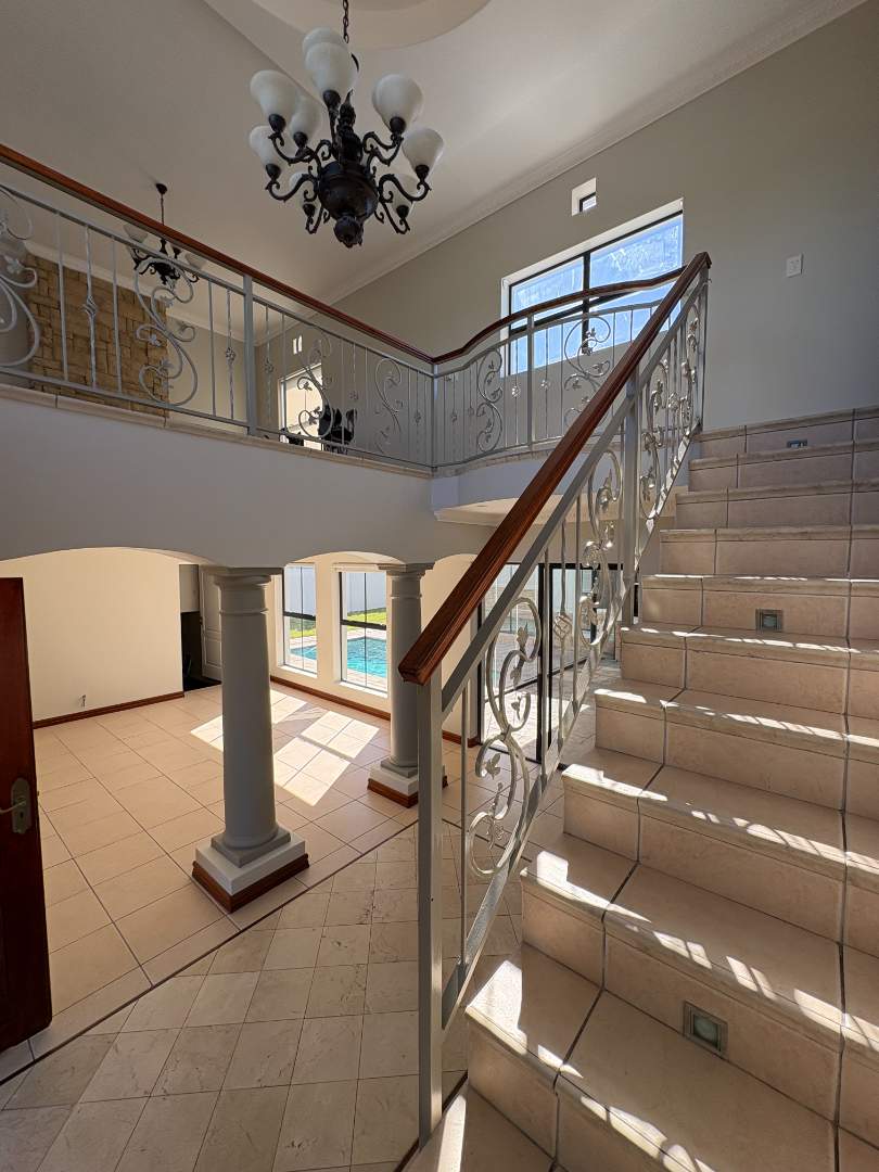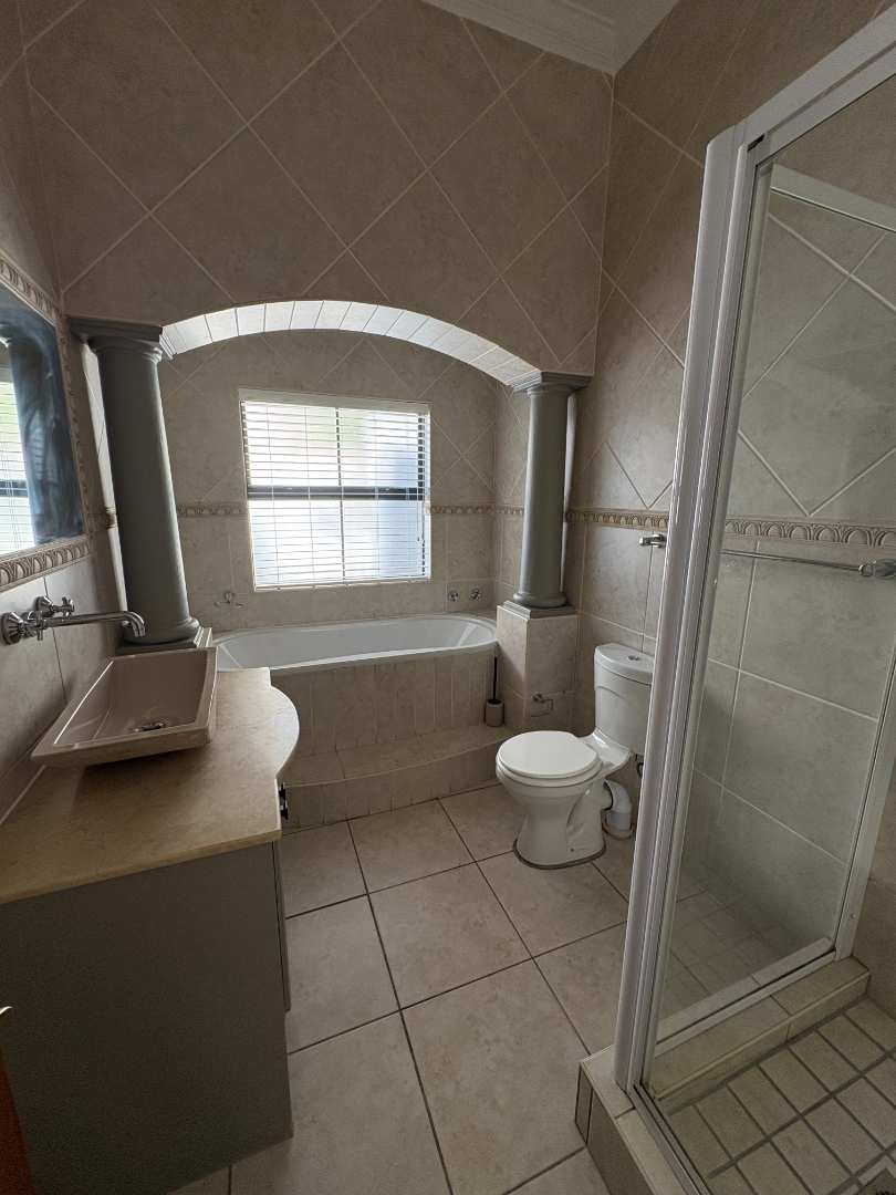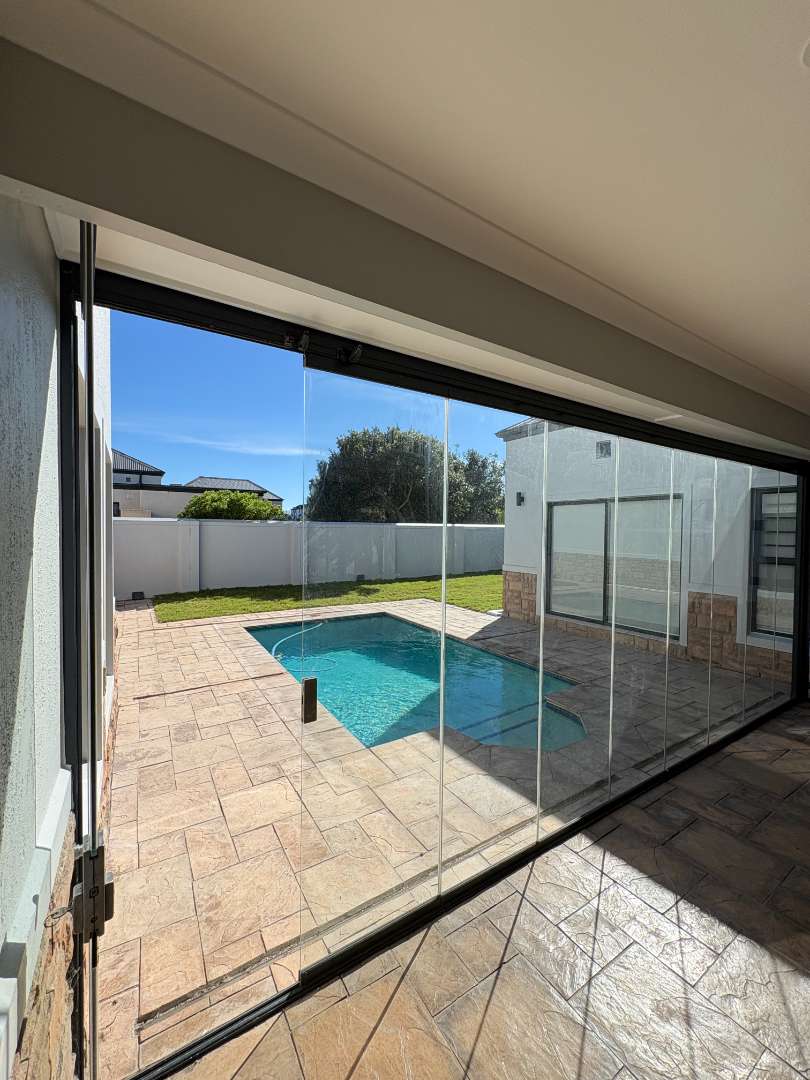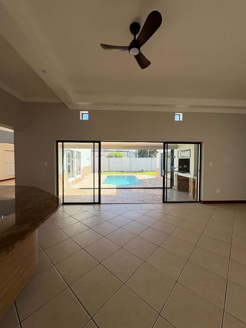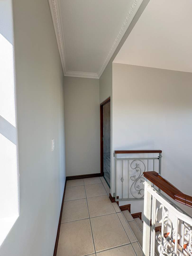 The ground floor offers three spacious bedrooms and two modern bathrooms, including a main suite with direct access to the lush back garden and pool area. For those who work from home, there is a dedicated office space with ample built-in cupboards. The heart of the home is the open plan lounge, dining, and kitchen area, which includes a separate scullery for added convenience. Additionally, the property features a double automated garage with space for two extra cars.