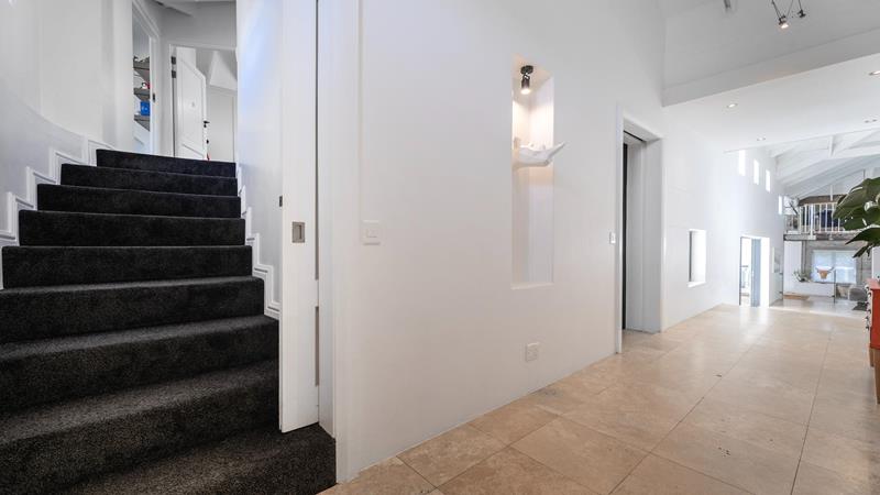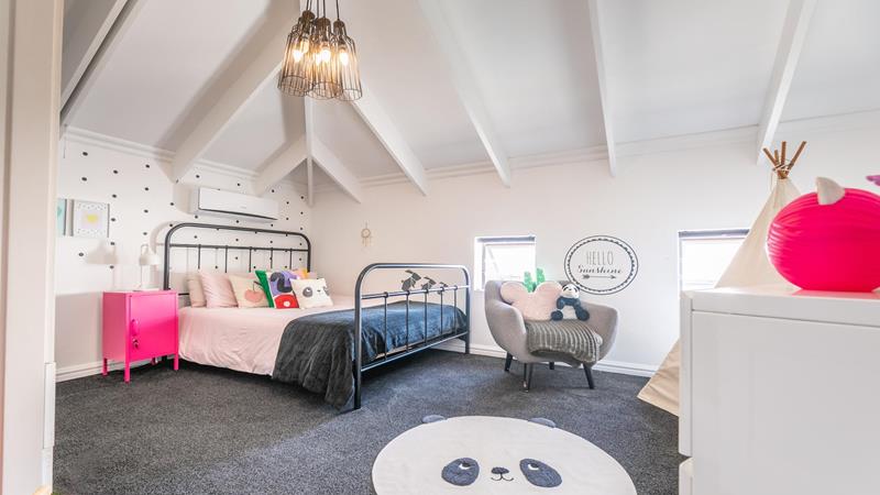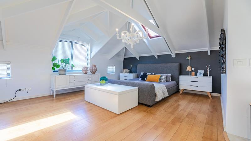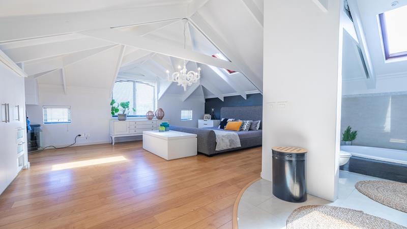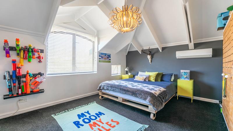 The main bedroom is generously sized, featuring built-in cupboards and an ensuite bathroom. It is conveniently located up a half-stairwell (not a full double storey) just off the foyer. A sprawling mezzanine provides additional valuable floor space, perfect for a study, gym, library, or play area.