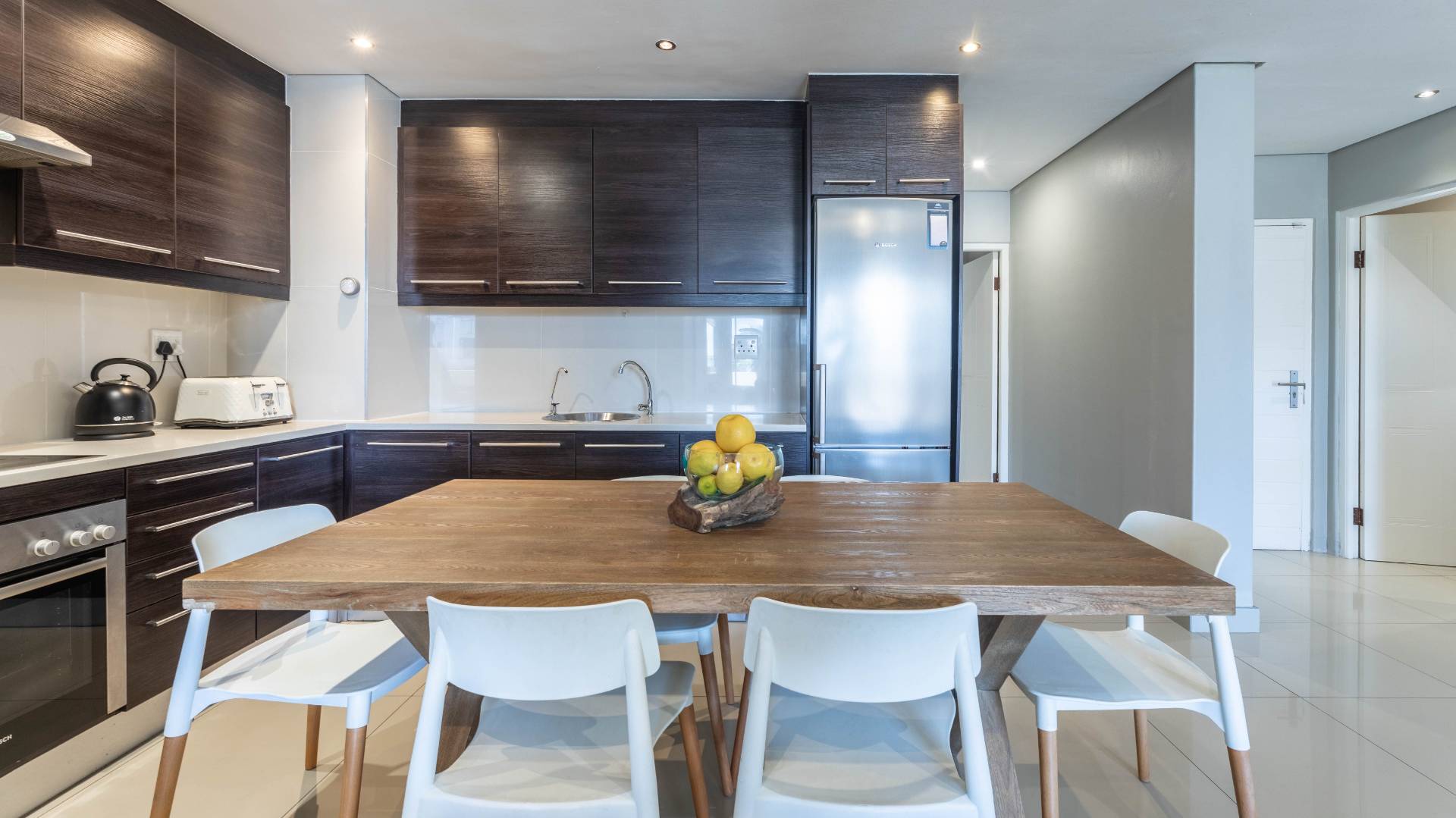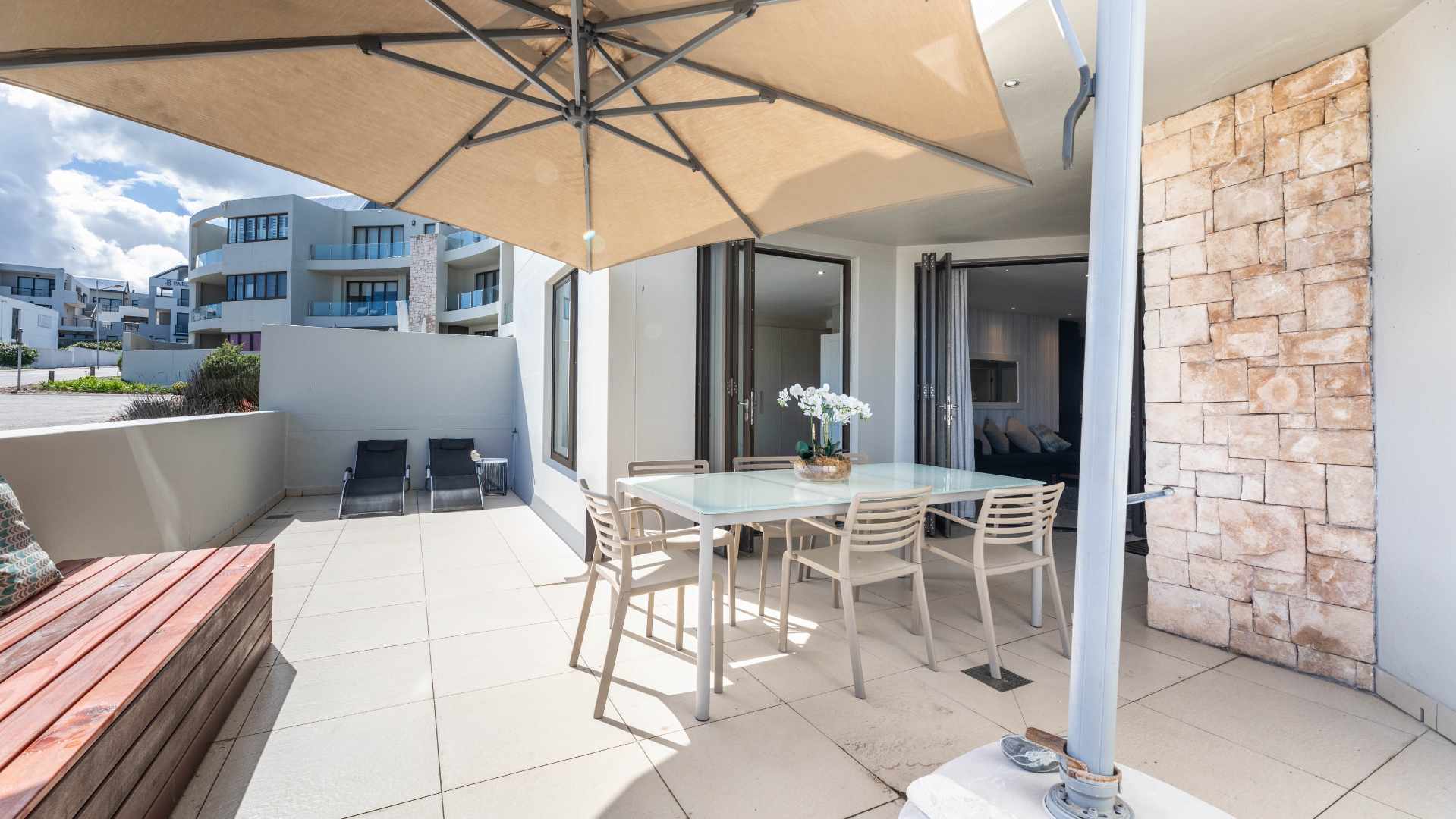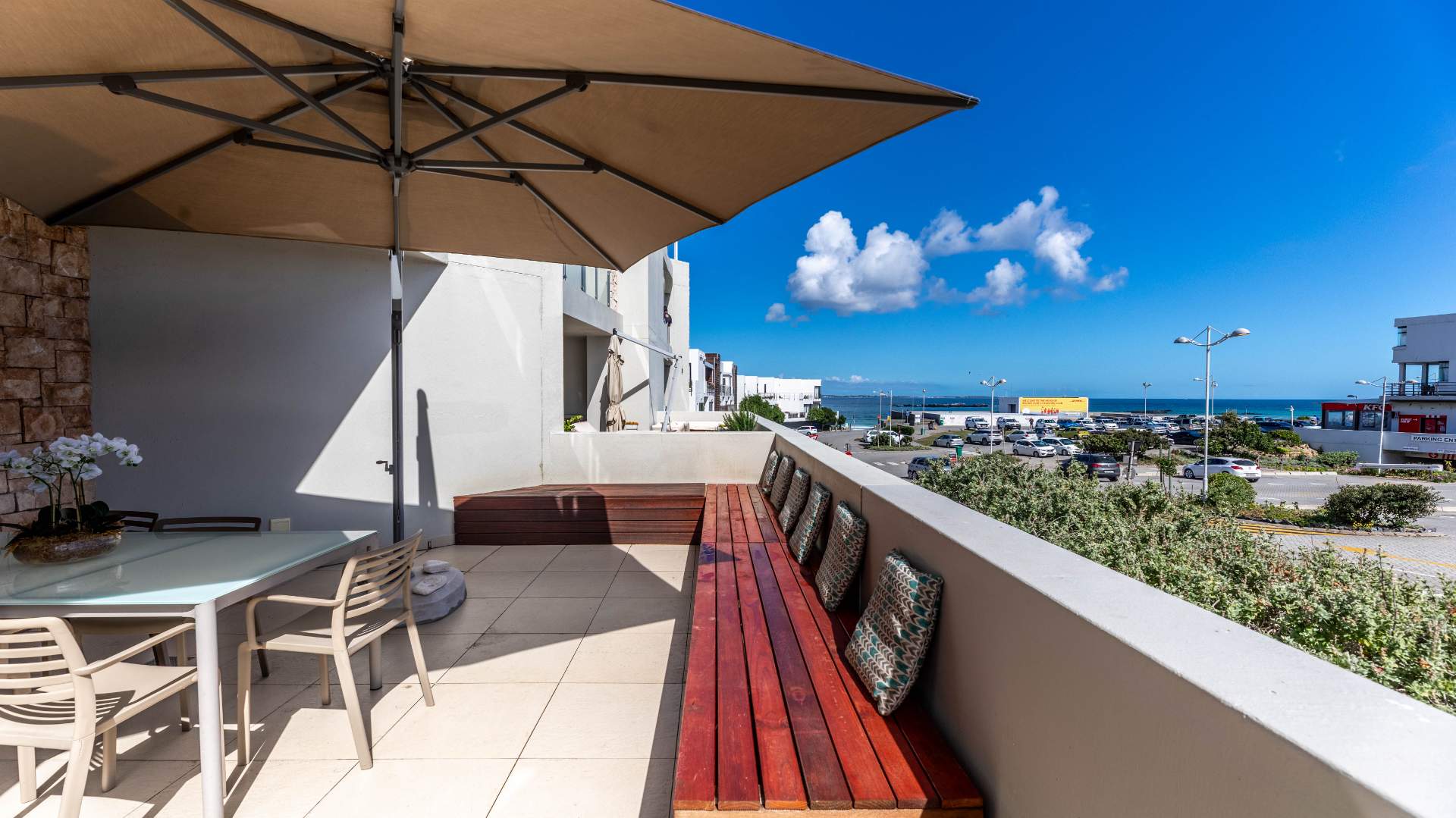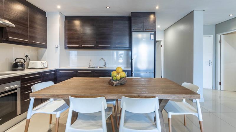 The open-plan kitchen with scullery/laundry connects seamlessly to the living and dining area, with stacker doors opening to a large balcony featuring built-in benches — the ultimate sundowner setting overlooking Robben Island and the Atlantic Ocean.