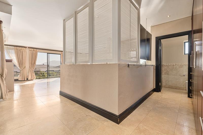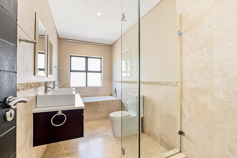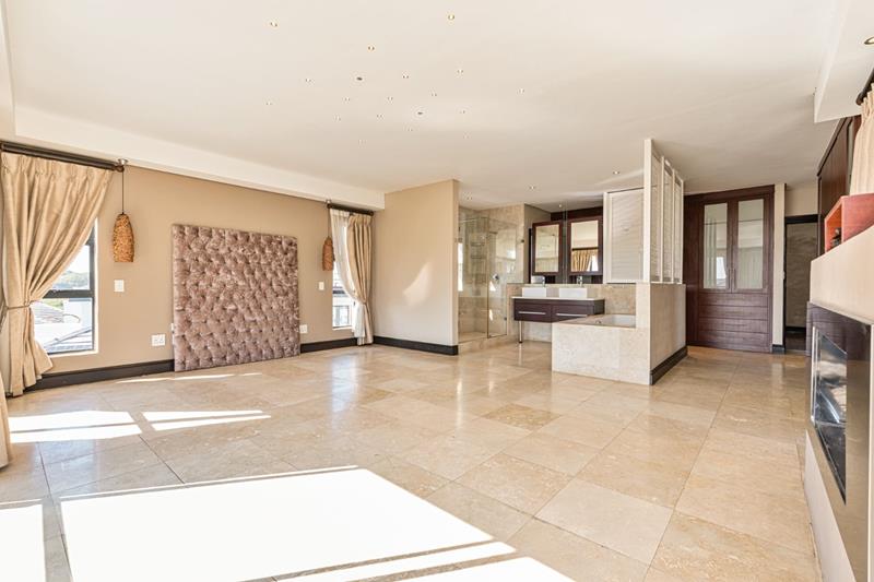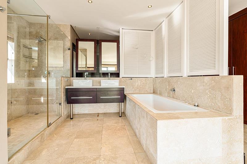 - The open-plan en-suite bathroom features dual shower heads, double vanities, an extra-