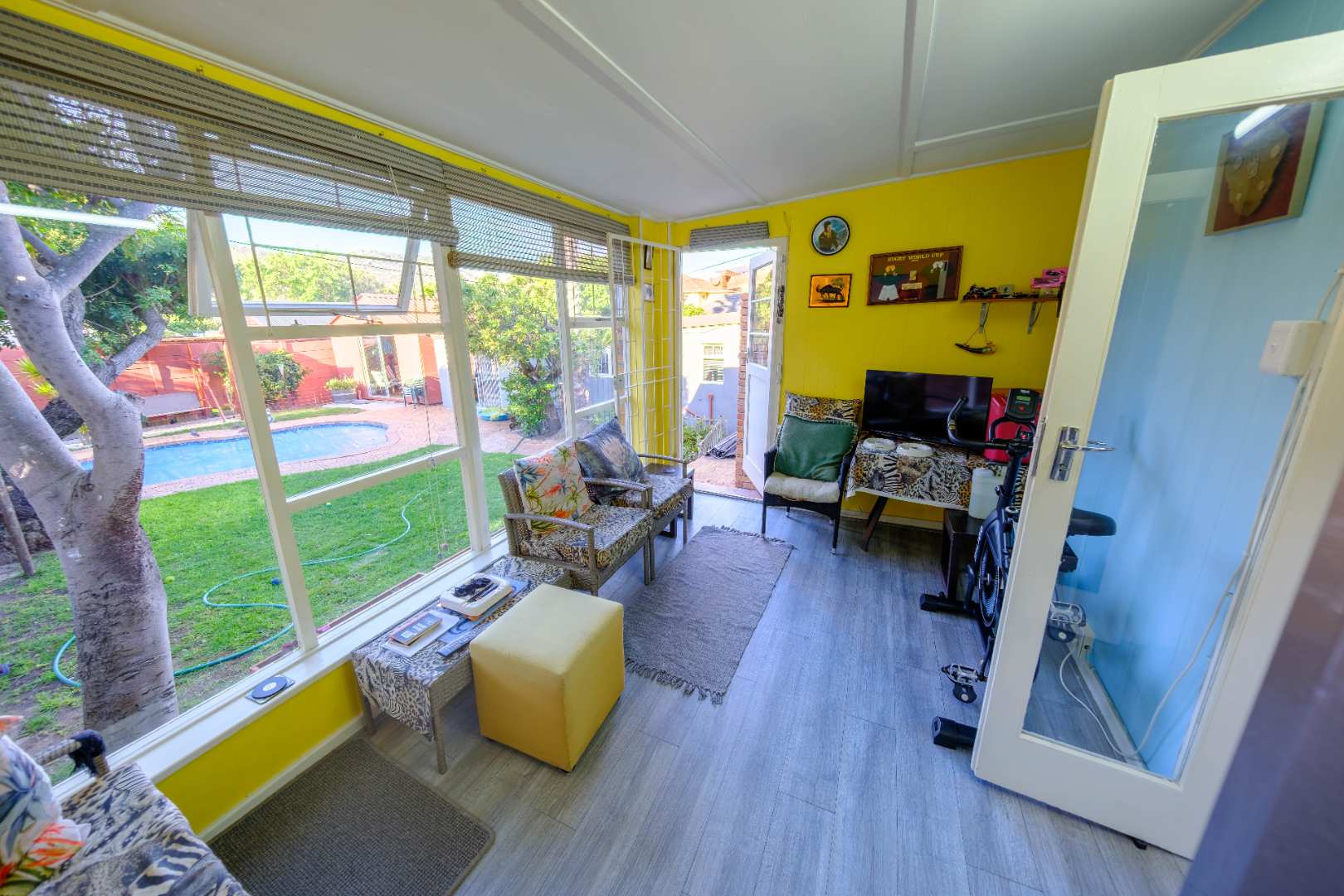 Step outside to enjoy a private haven with a solar-heated swimming pool, a lawned garden, and a dedicated outdoor man cave – the ultimate spot for relaxation or entertaining.