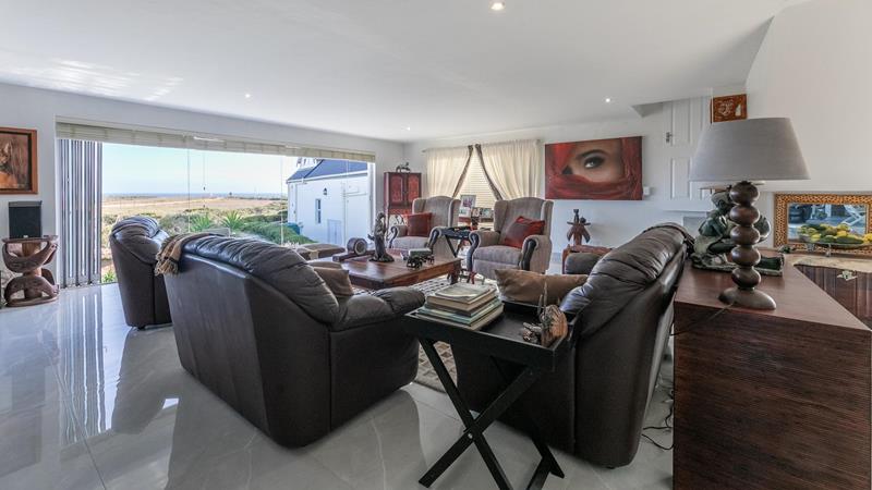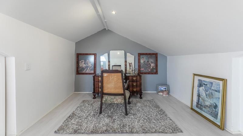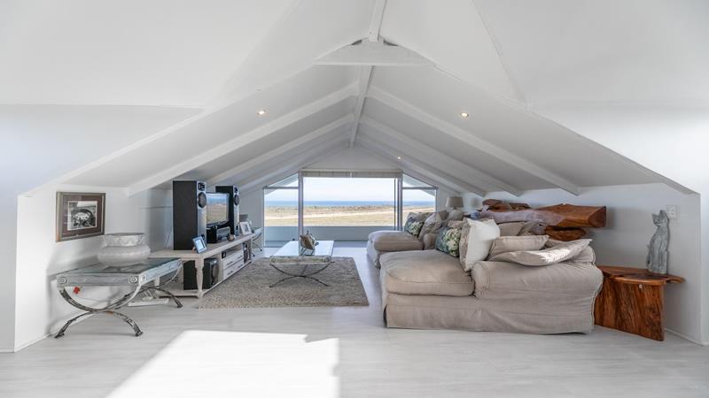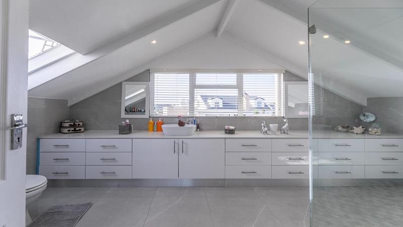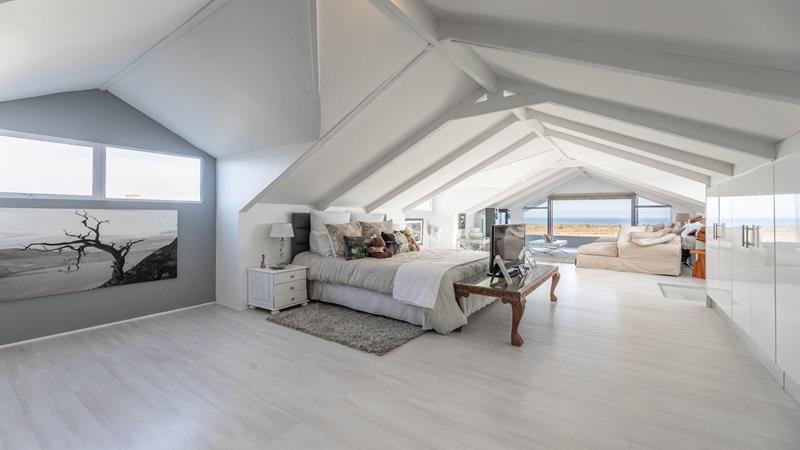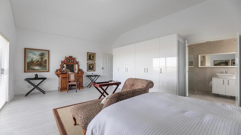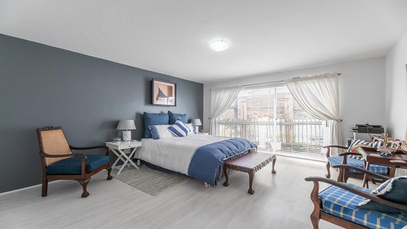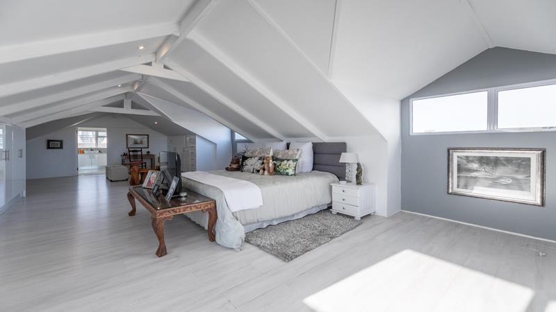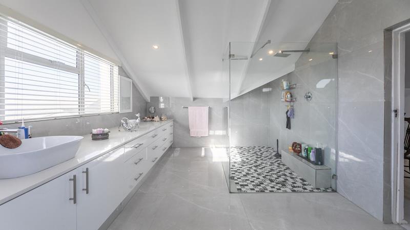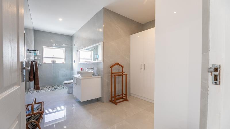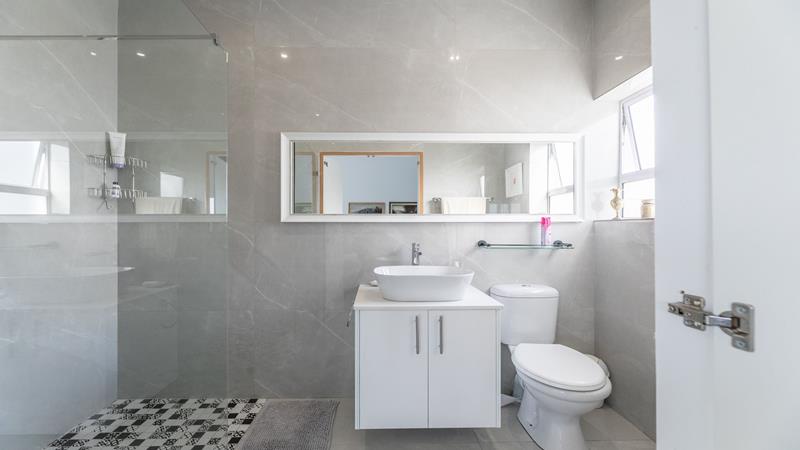 Upstairs, has an expansive and modern layout, with a patio. This open plan area has the main bedroom, dressing space and bathroom and includes a chilling area. Enjoy your morning coffee on the sheltered patio while taking in views of Table Mountain and the sea.
