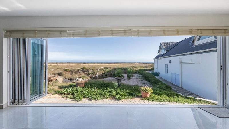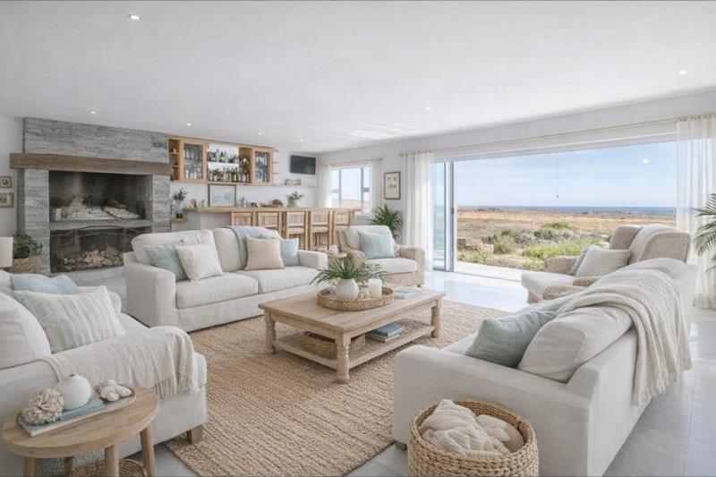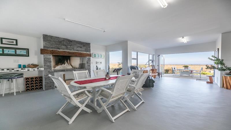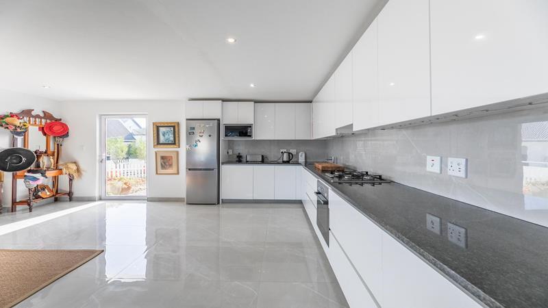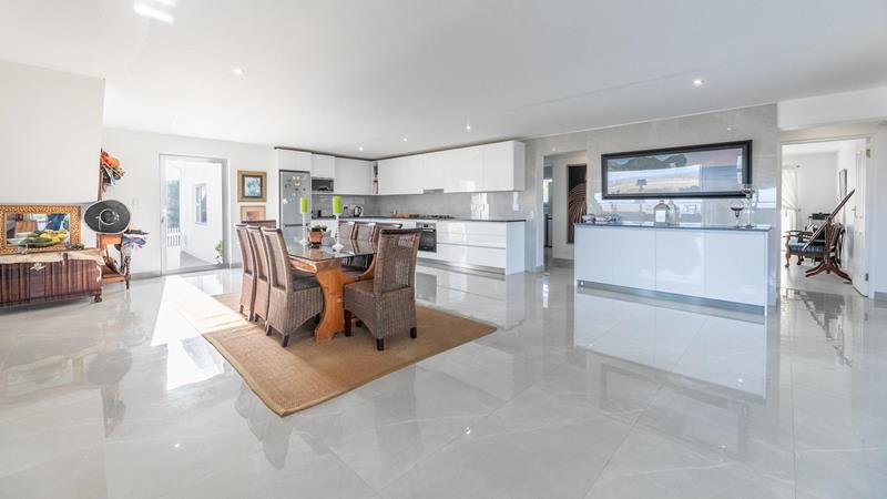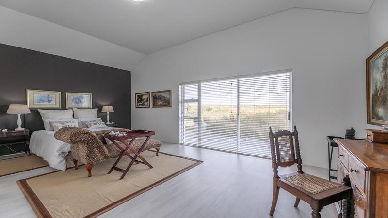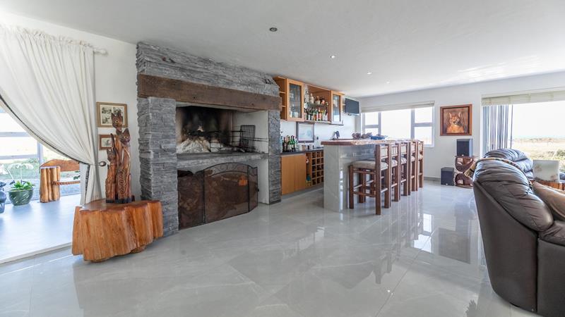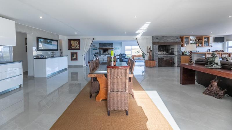 This newly built property boasts a generous open plan living area styled to accentuate the views. It features a built-in fireplace/braai, dining area, and kitchen that seamlessly transitions into the fabulous indoor braai and entertainment area. There is a separate scullery and pantry. Large aluminium stack doors in the lounge and braai area effortlessly connect the interior with the beauty of nature outdoors.