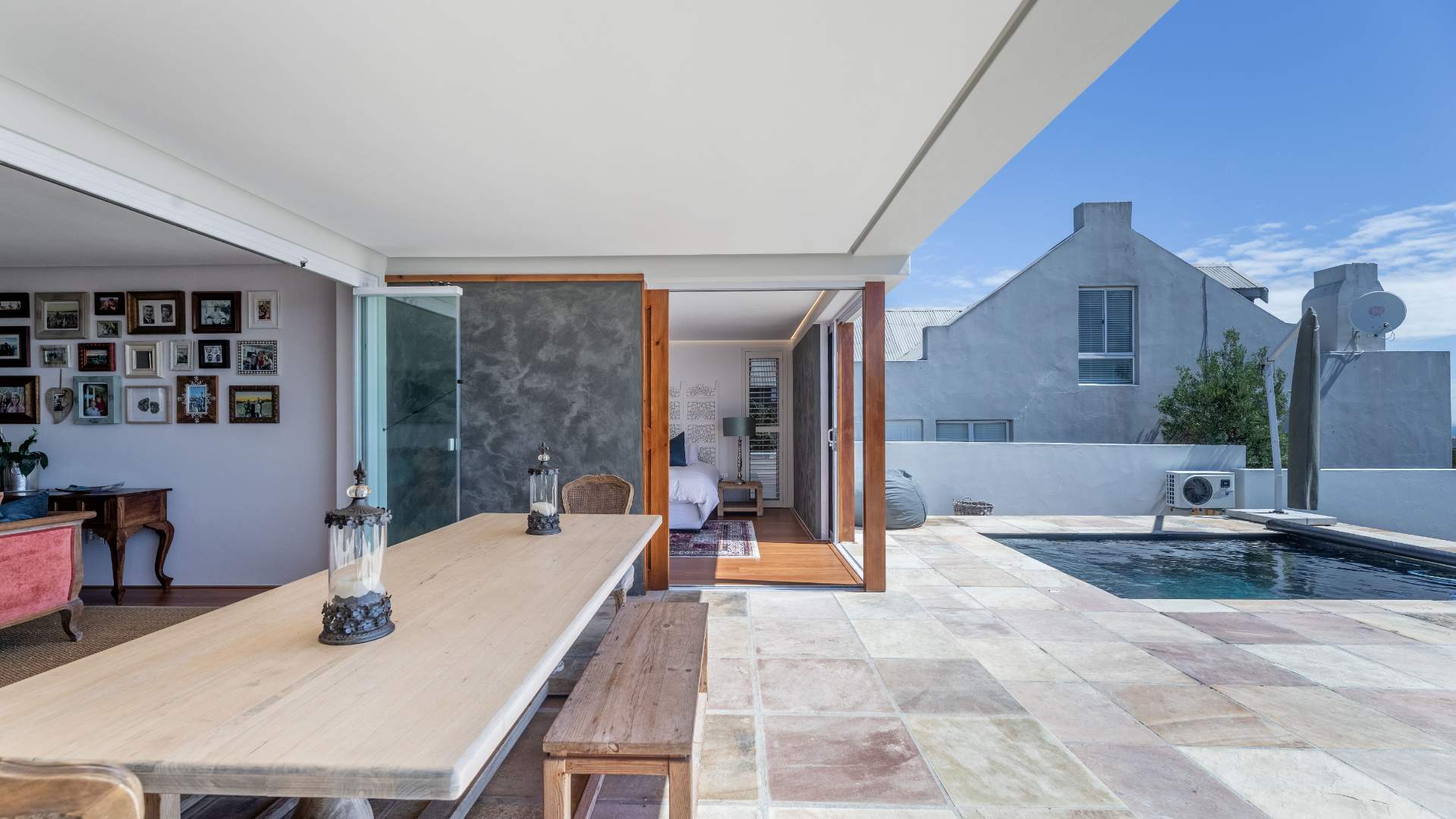 The open-plan lounge, dining area, and kitchen are designed for effortless entertainment, extending onto a wind-protected patio with a swimming pool. From here, you can enjoy sweeping views of the greenbelt, ocean, and spectacular sunsets throughout the year.