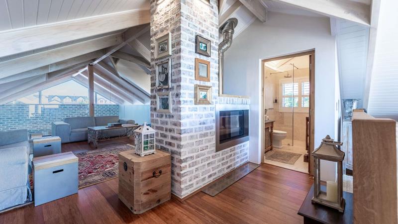 A statement double-sided fireplace bridges the open plan lounge and dining areas, offering seamless yet distinctly defined areas. Warmth and atmosphere are created whilst still maintaining an open, flowing layout.