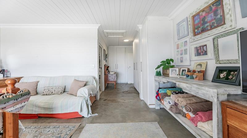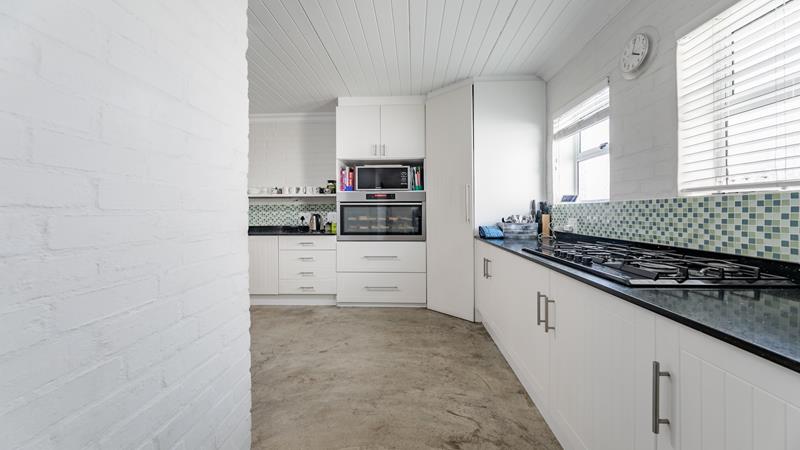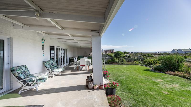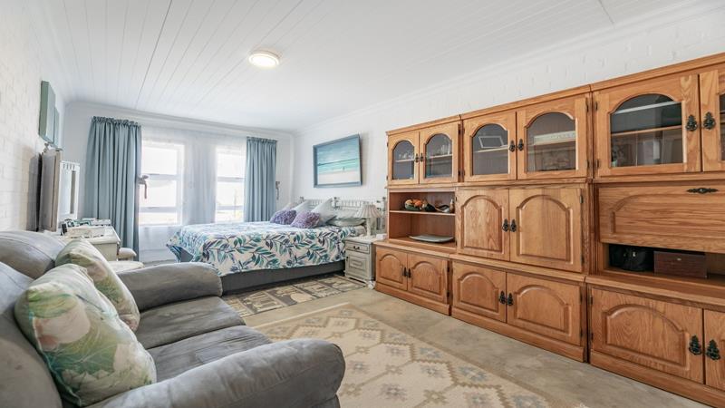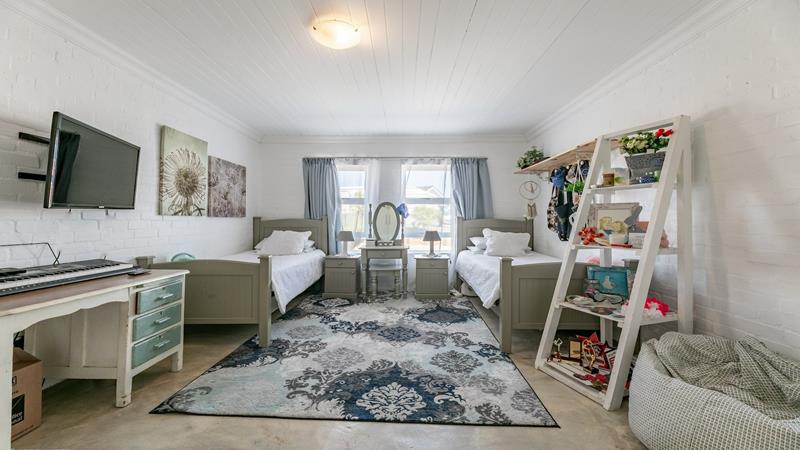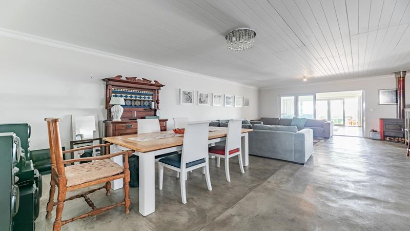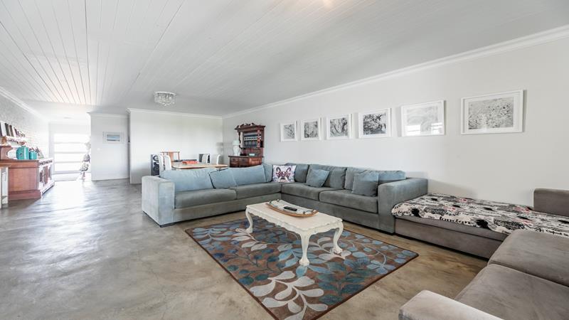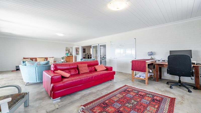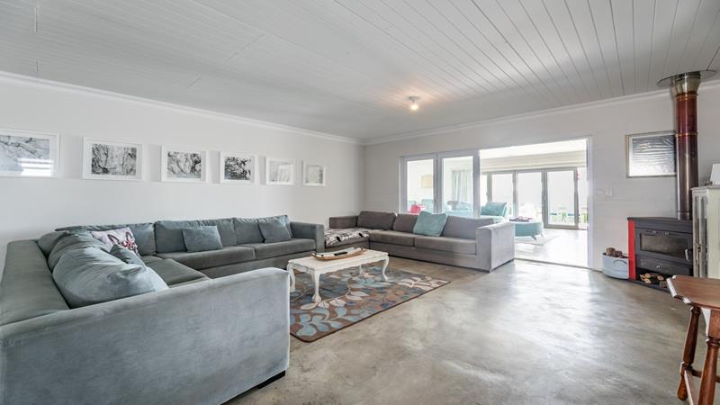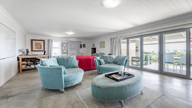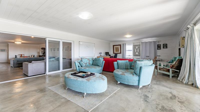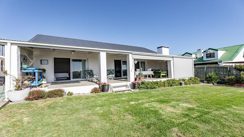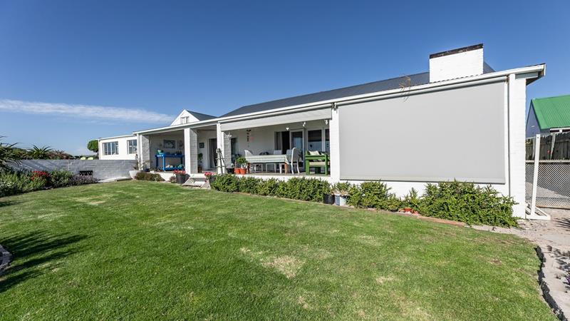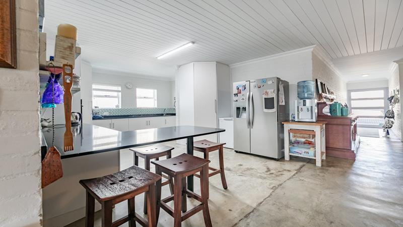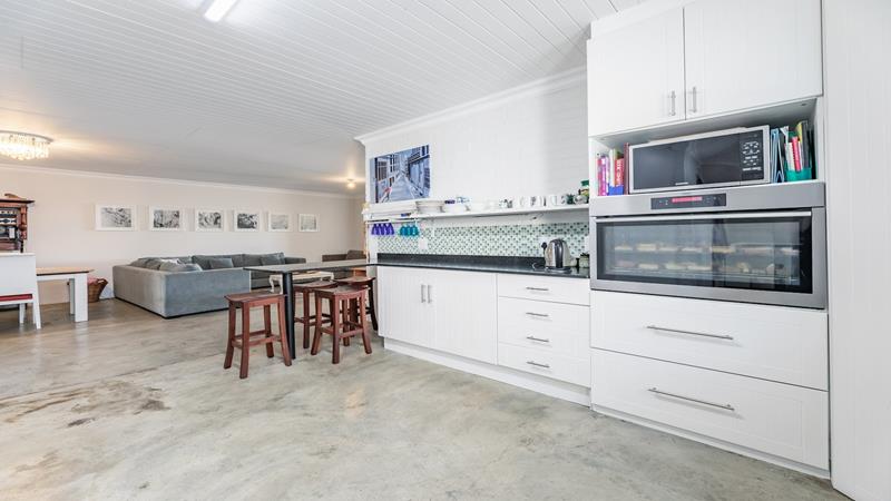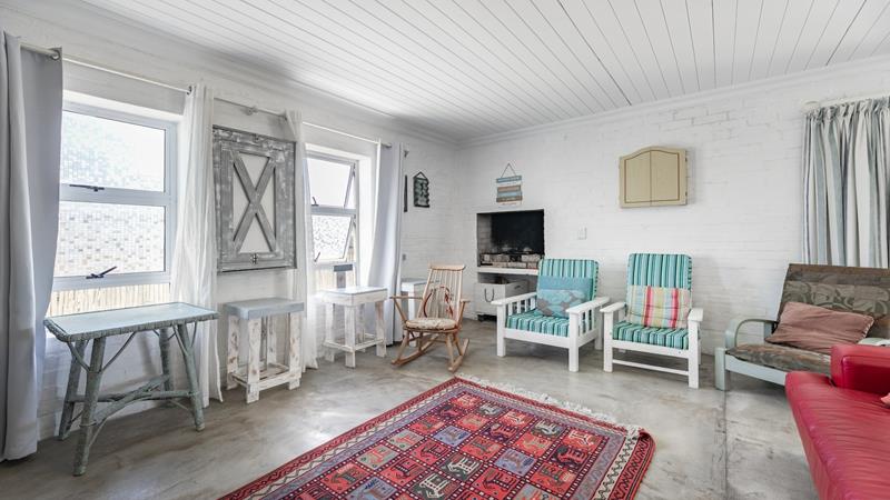 The kitchen is equipped with an electric oven and hob unit, along with built-in cupboards. A scullery is conveniently located behind the kitchen, keeping those dirty dishes out of sight. The first lounge boasts a modern fireplace, perfect for cozying up during the West Coast Winters. The second lounge includes a built-in braai and opens up to a large patio for enjoying those Summer days and brilliant sunsets.