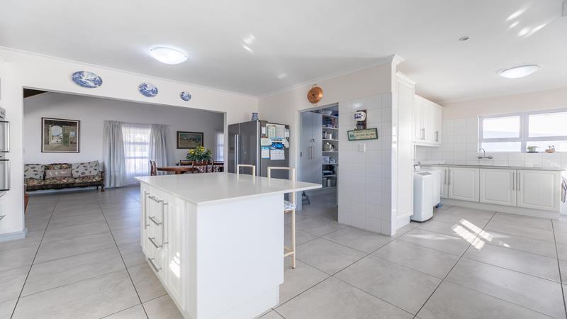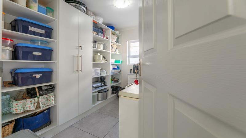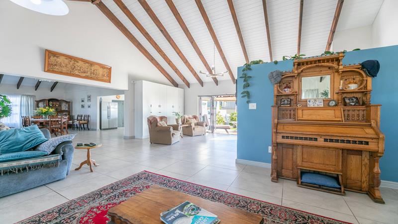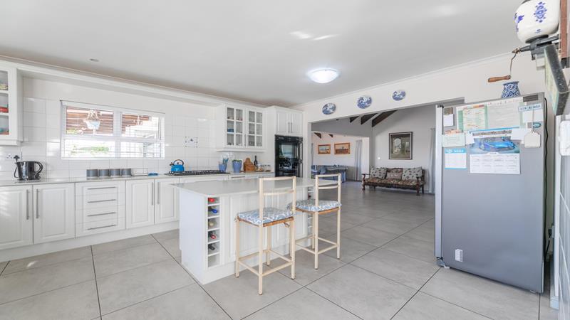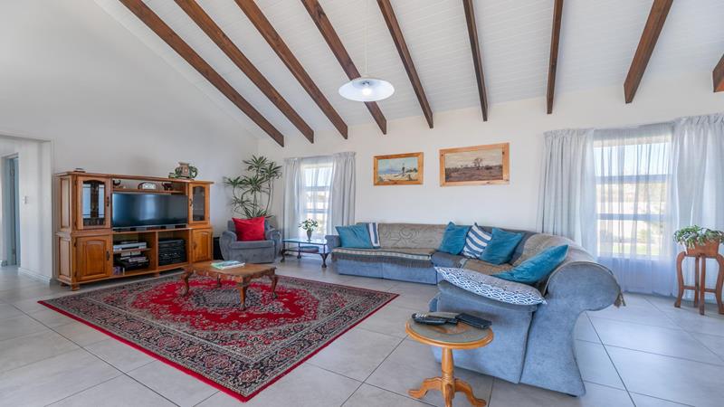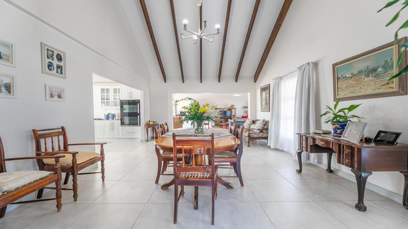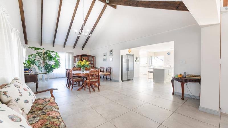 The spacious living room, accentuated by exposed beams, seamlessly connects to the dining area and a well-appointed kitchen. A walk-in pantry and separate scullery provide ample storage space for your convenience. The indoor braai area, just off the main lounge, provides a second entertainment area. With stack doors opening from the living room, a covered patio and charming garden can be enjoyed.