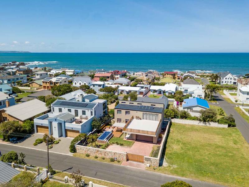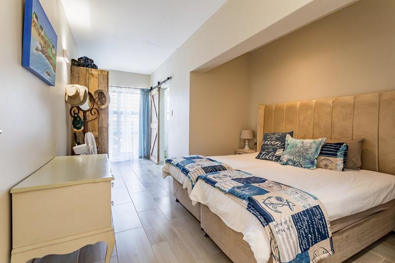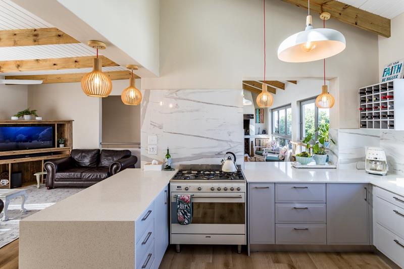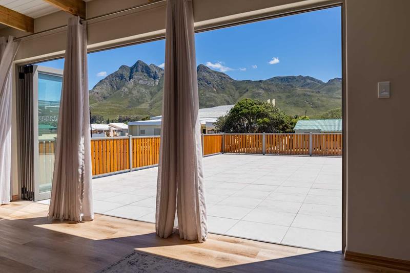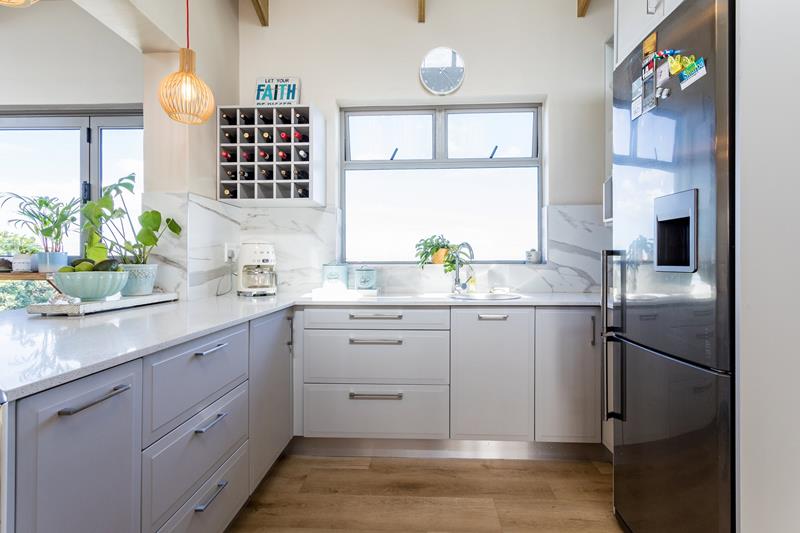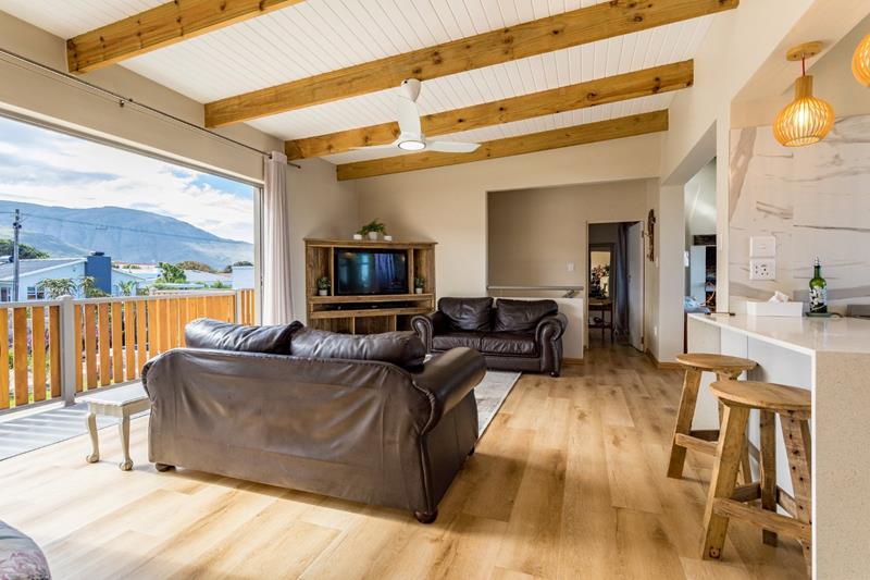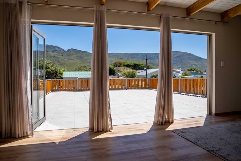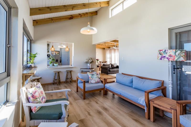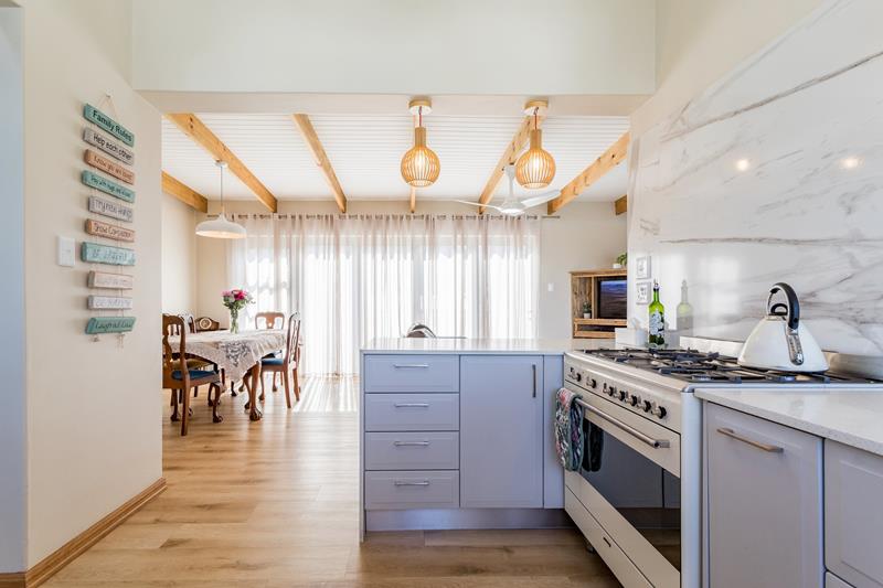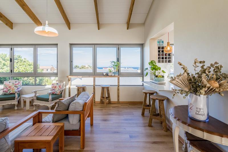 The kitchen is a light, bright space, complete with a large picture window framing stunning sea views. Its open-plan design includes a separate scullery, abundant storage with numerous cupboards, drawers, and a walk-in pantry. The kitchen is equipped with plumbing for a dishwasher and features a prep bowl. Please note that the SMEG stove is not included in the sale. Adjacent to the kitchen, an enclosed braai room boasts sea views and large stacker windows, making it perfect for entertaining.
