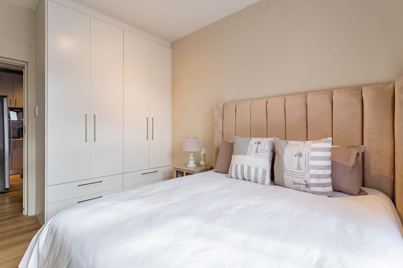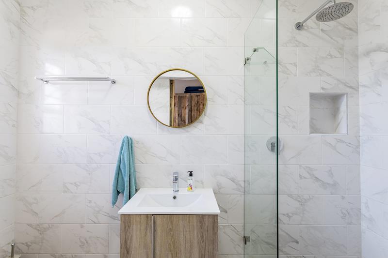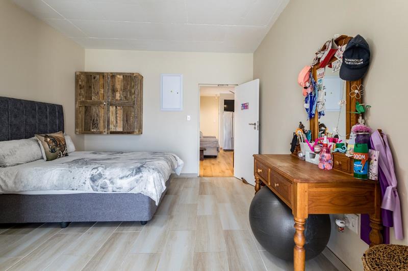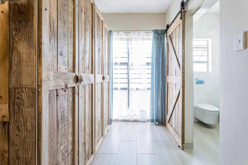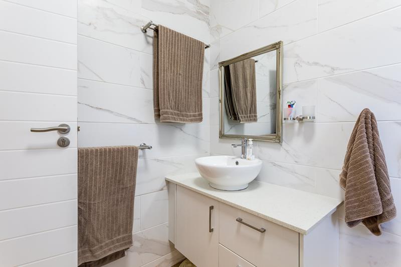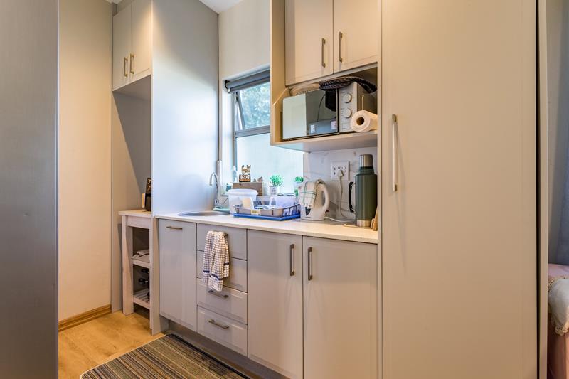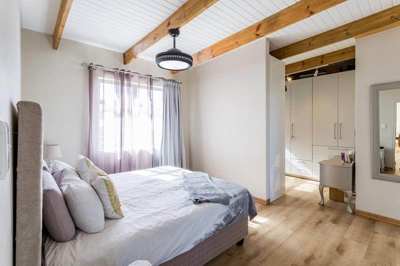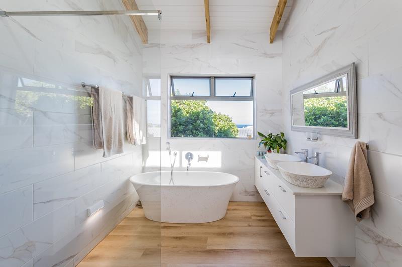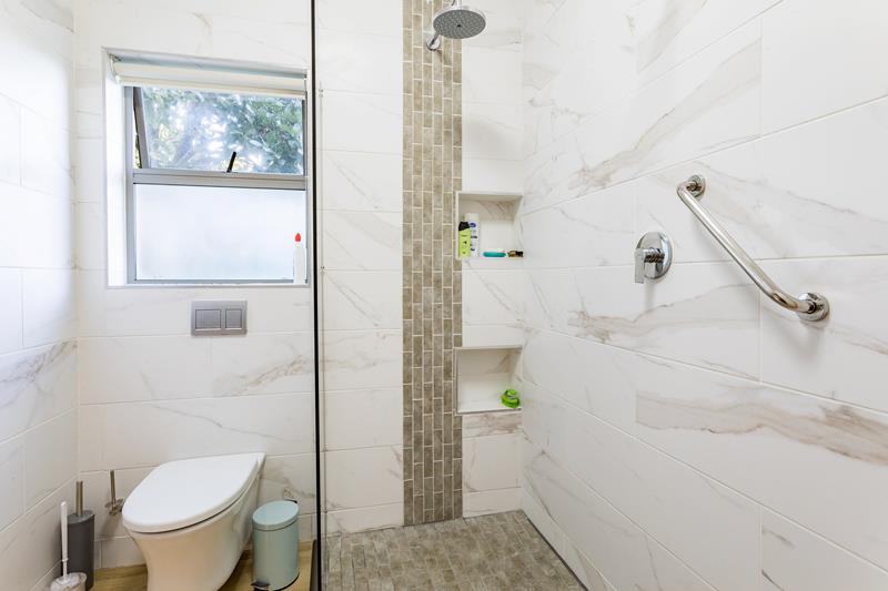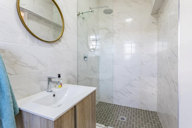 The kitchen is a light, bright space, complete with a large picture window framing stunning sea views. Its open-plan design includes a separate scullery, abundant storage with numerous cupboards, drawers, and a walk-in pantry. The kitchen is equipped with plumbing for a dishwasher and features a prep bowl. Please note that the SMEG stove is not included in the sale. Adjacent to the kitchen, an enclosed braai room boasts sea views and large stacker windows, making it perfect for entertaining.