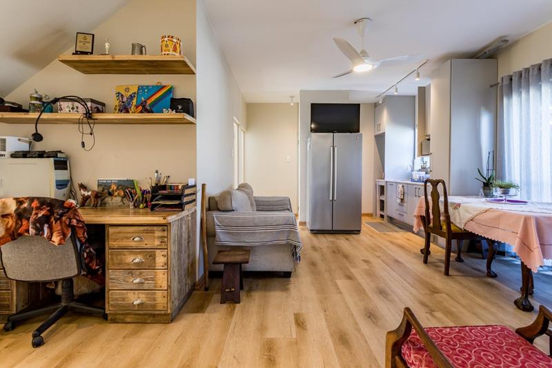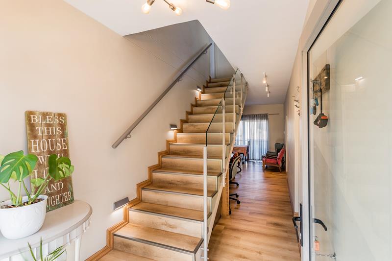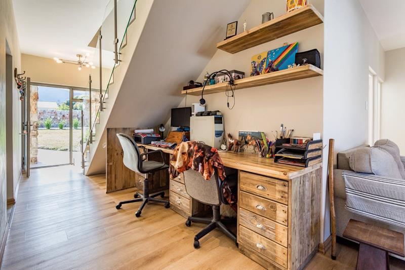 Downstairs, a secondary lounge area is complemented by a kitchenette and a fitted office space. This level hosts four additional bedrooms, each with built-in cupboards. Two of these bedrooms boast ensuite bathrooms. A small separate study or storeroom provides access to the laundry room, which is equipped for both a washing machine and tumble dryer. The entire house is graced with vinyl flooring, except for the two ensuite bedrooms downstairs, which are tiled.