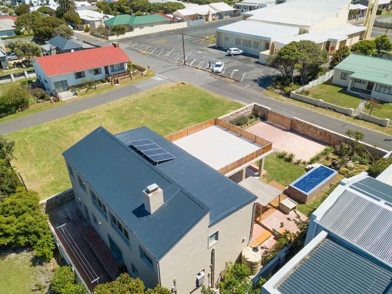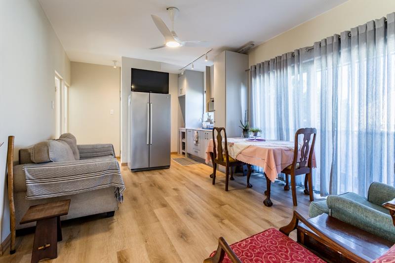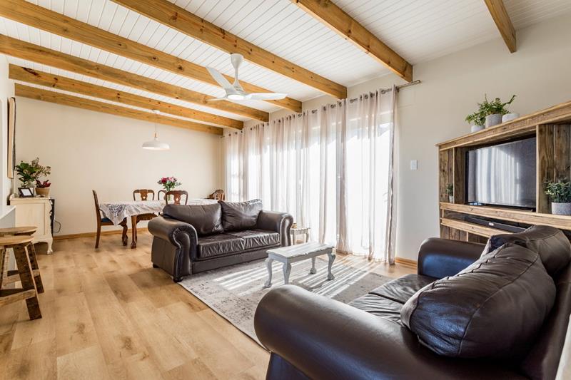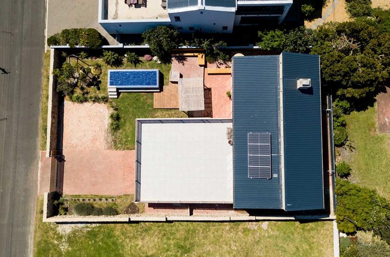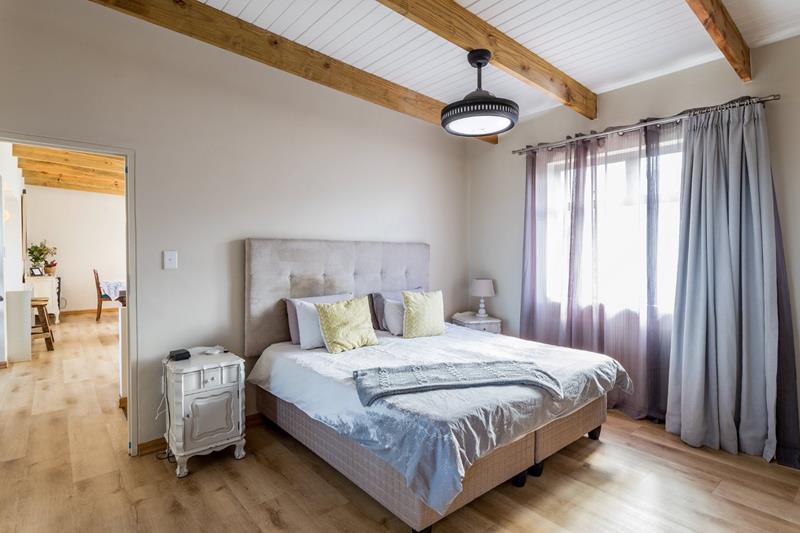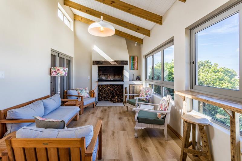 This home is equipped with a 5kW solar solution and four panels, along with two 28-litre gas geysers. Rainwater is efficiently collected into three 2400-litre water tanks, and the built-in septic tank has a capacity of 5500 liters. The property is fully walled and includes a cemcrete-lined pool (please note there is no pool pump). At night, the garden is beautifully illuminated with subtle lighting.