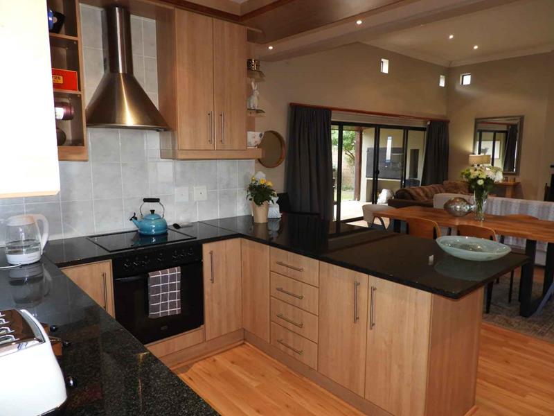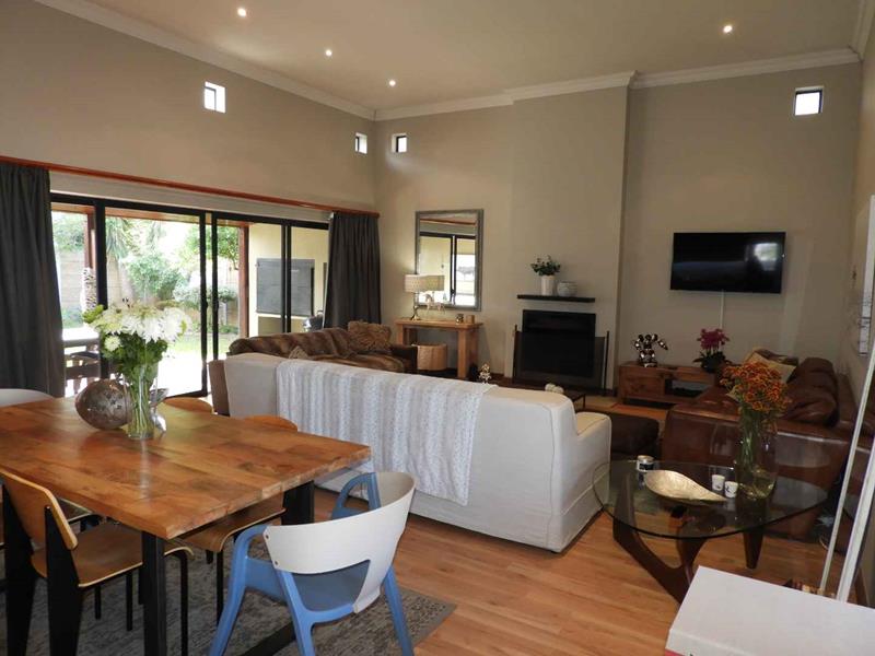 The lounge area is a true highlight, featuring a cozy wood-burning fireplace — perfect for those cooler evenings. This space effortlessly opens up to the back garden, where you can enjoy the covered patio and braai area, ideal for outdoor gatherings and relaxation.