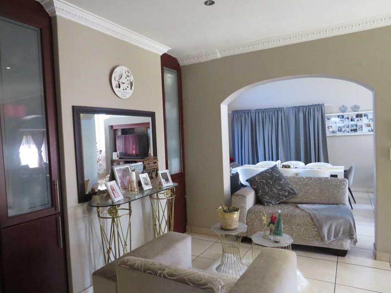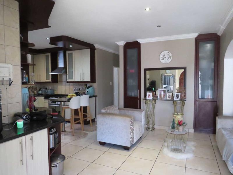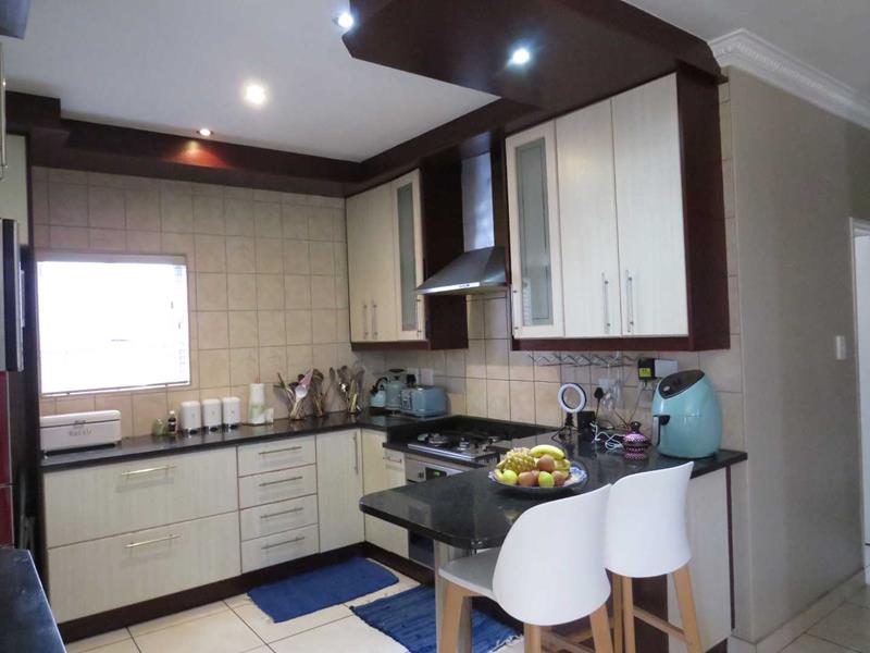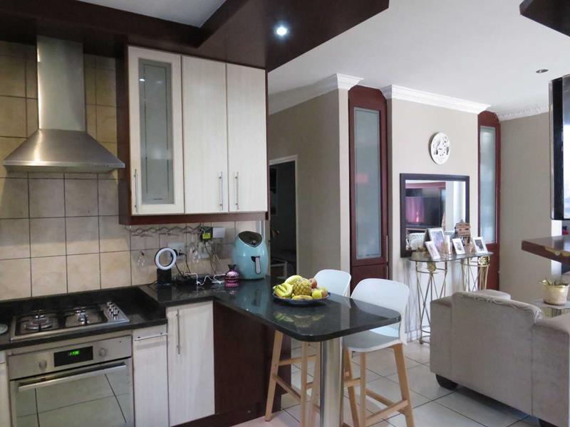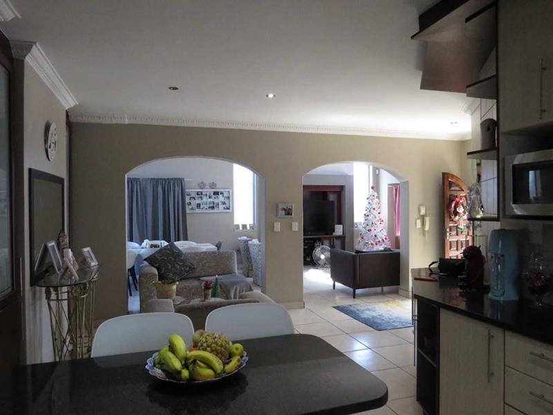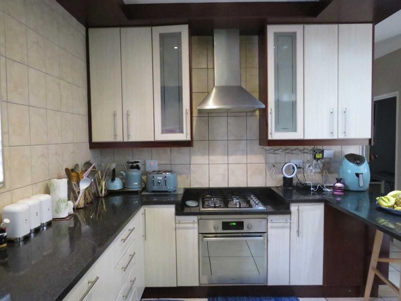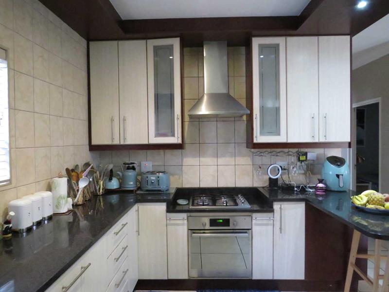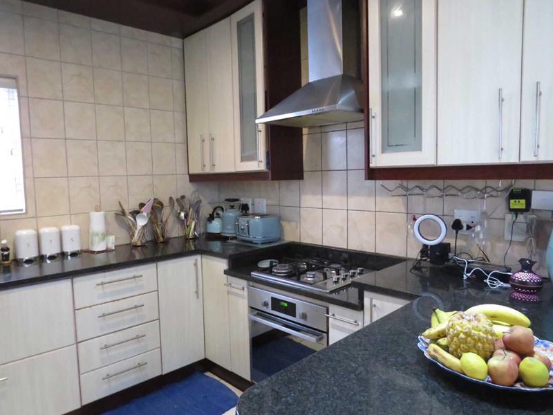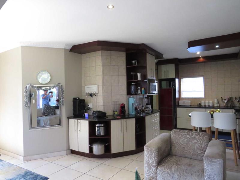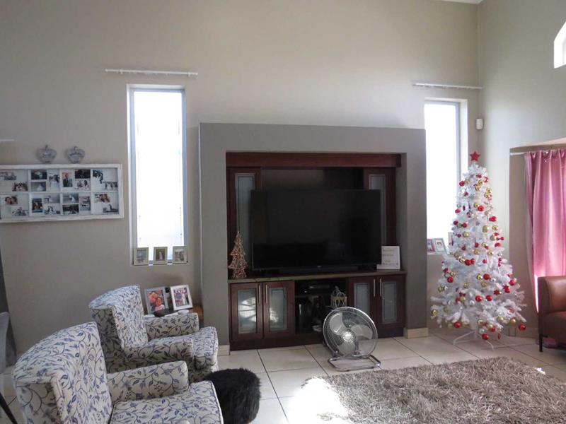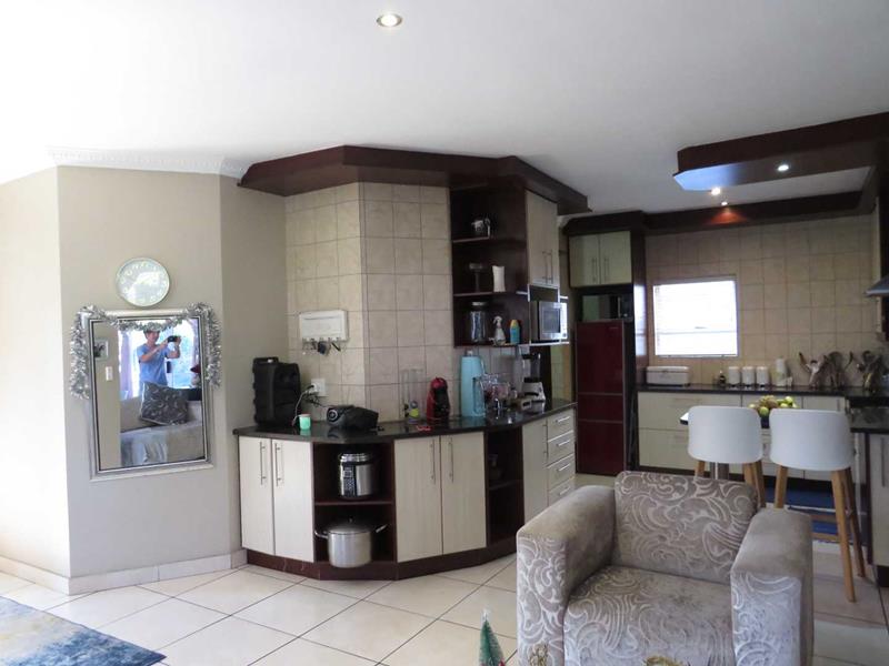This flows to the spacious lounge and dining areas with a built in TV cabinet which opens to the outside patio with a built in braai and small garden area.