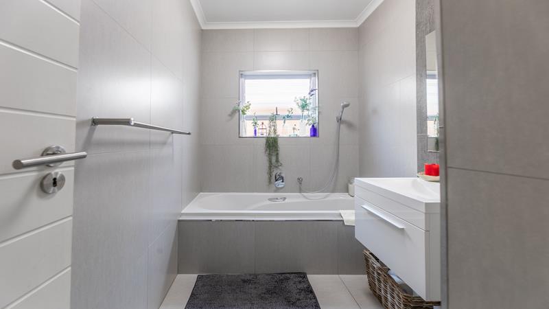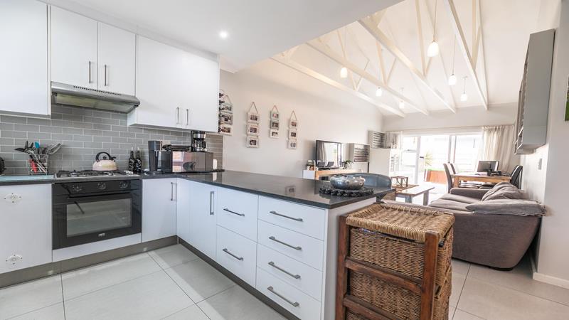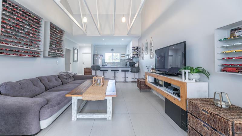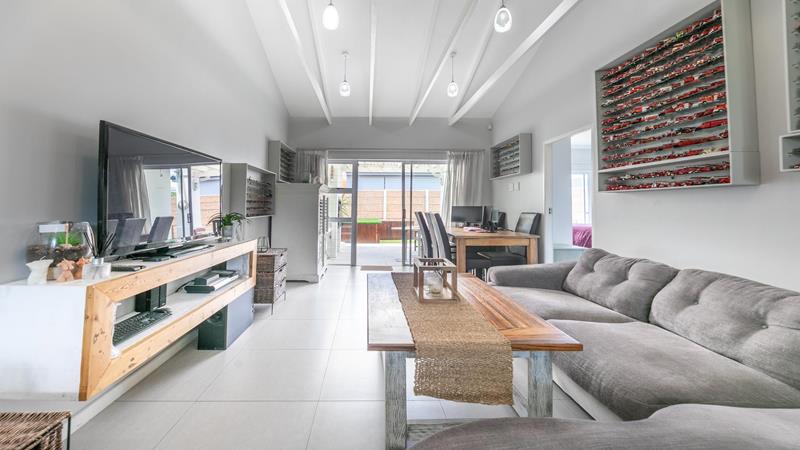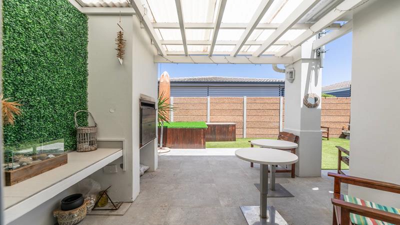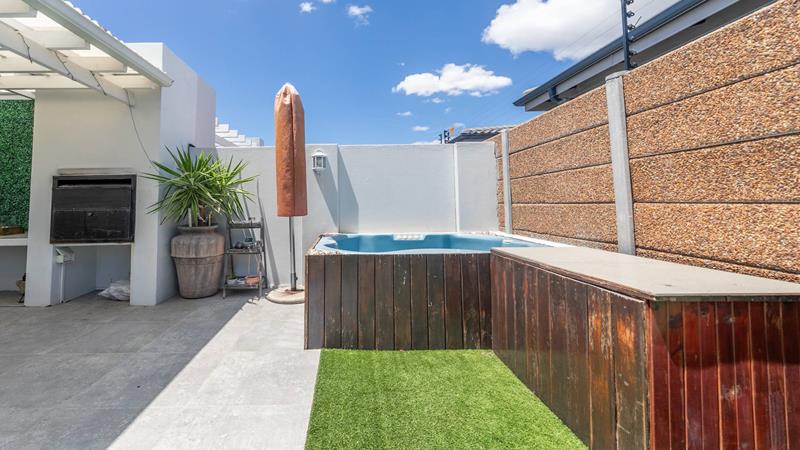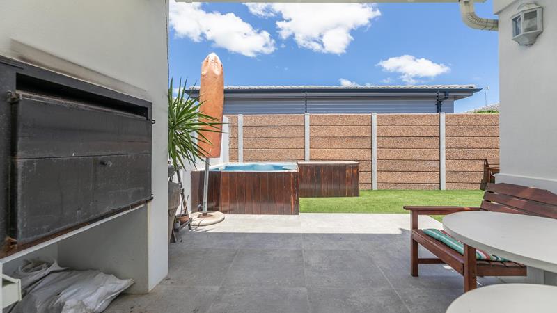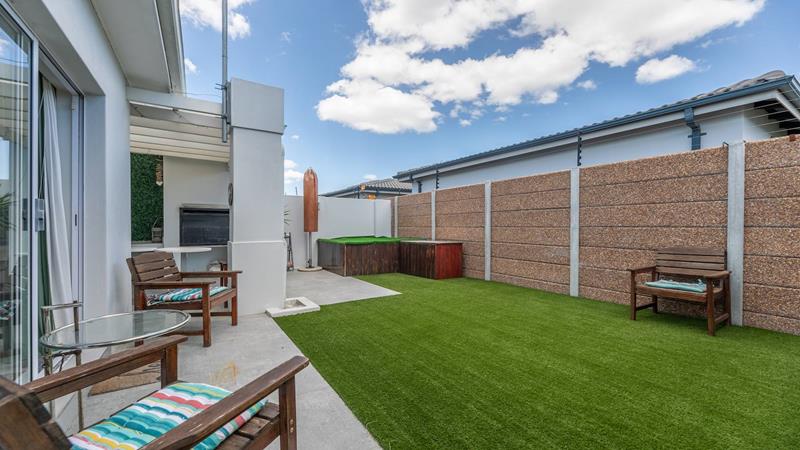 The heart of the home is its open-plan kitchen including gas hob, living, and dining area, which is both spacious and inviting. Highlighted by stylish exposed trusses, this area seamlessly extends to the outdoors, where you'll discover a low-maintenance garden oasis. The outdoor space is thoughtfully designed with a covered built-in braai area, a soothing jacuzzi, and an easy-care artificial grass section—ideal for entertaining or simply unwinding in the comfort of your own home.