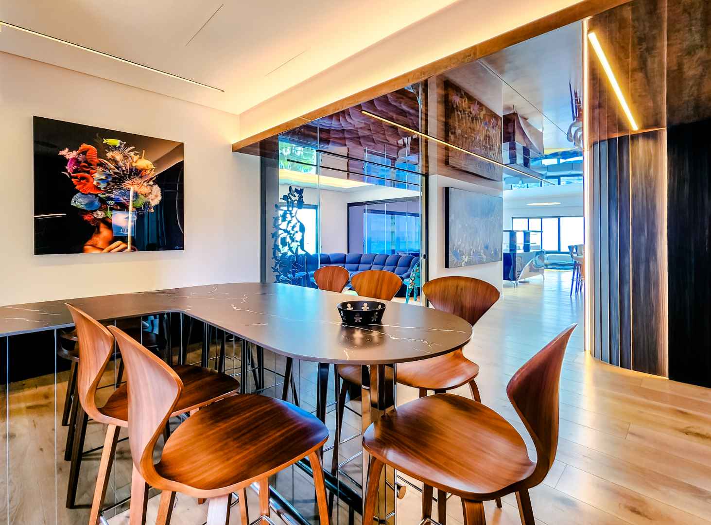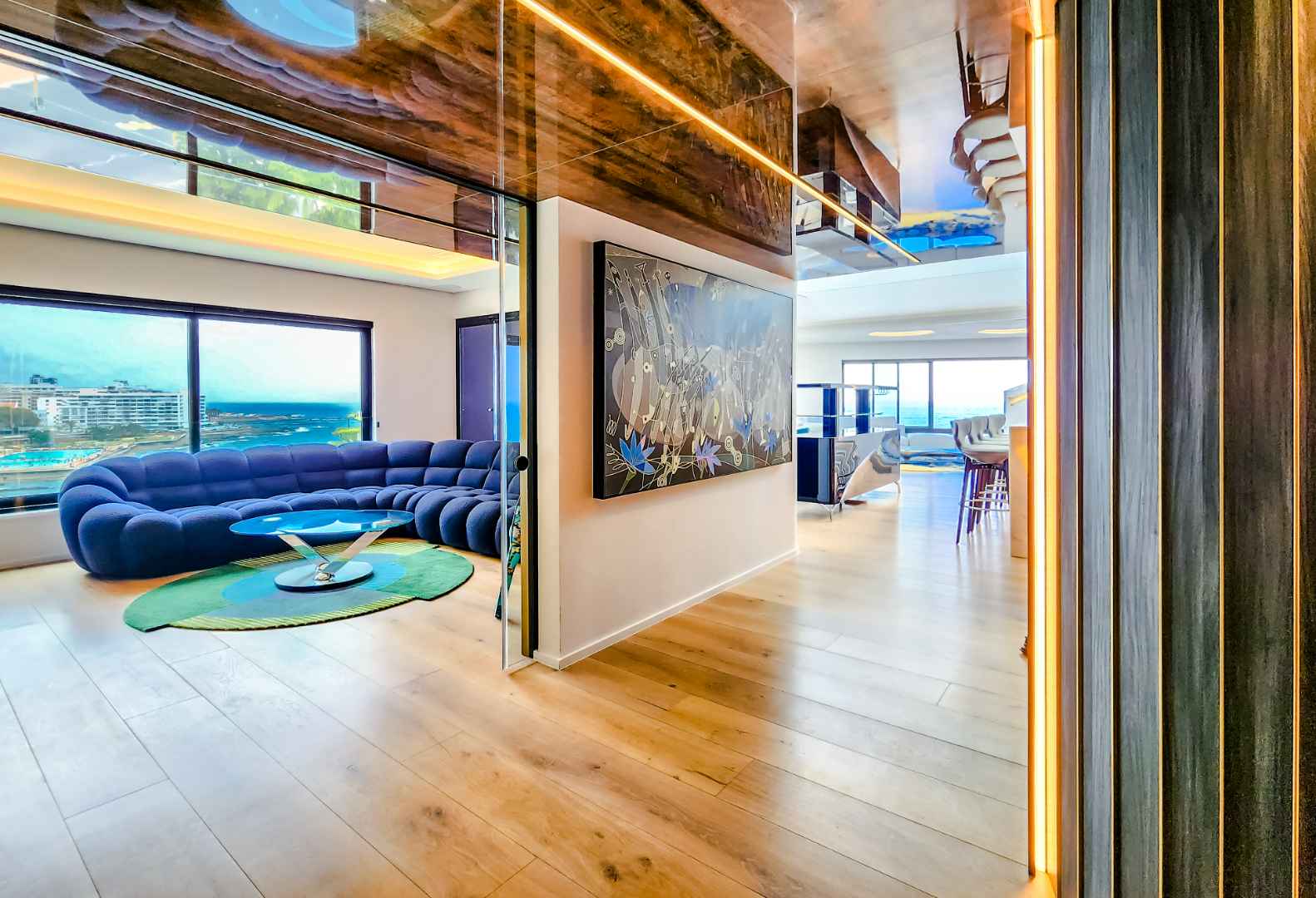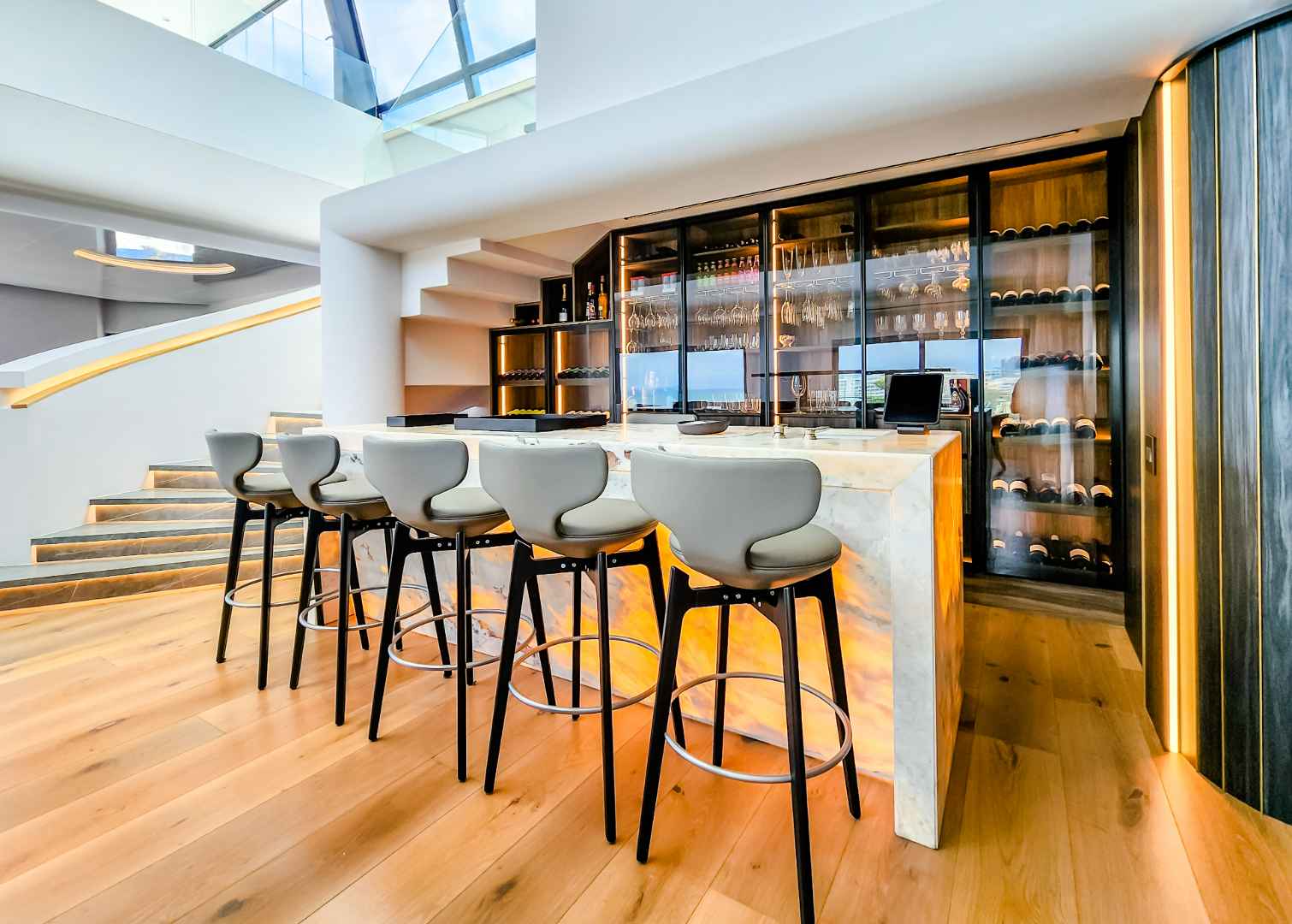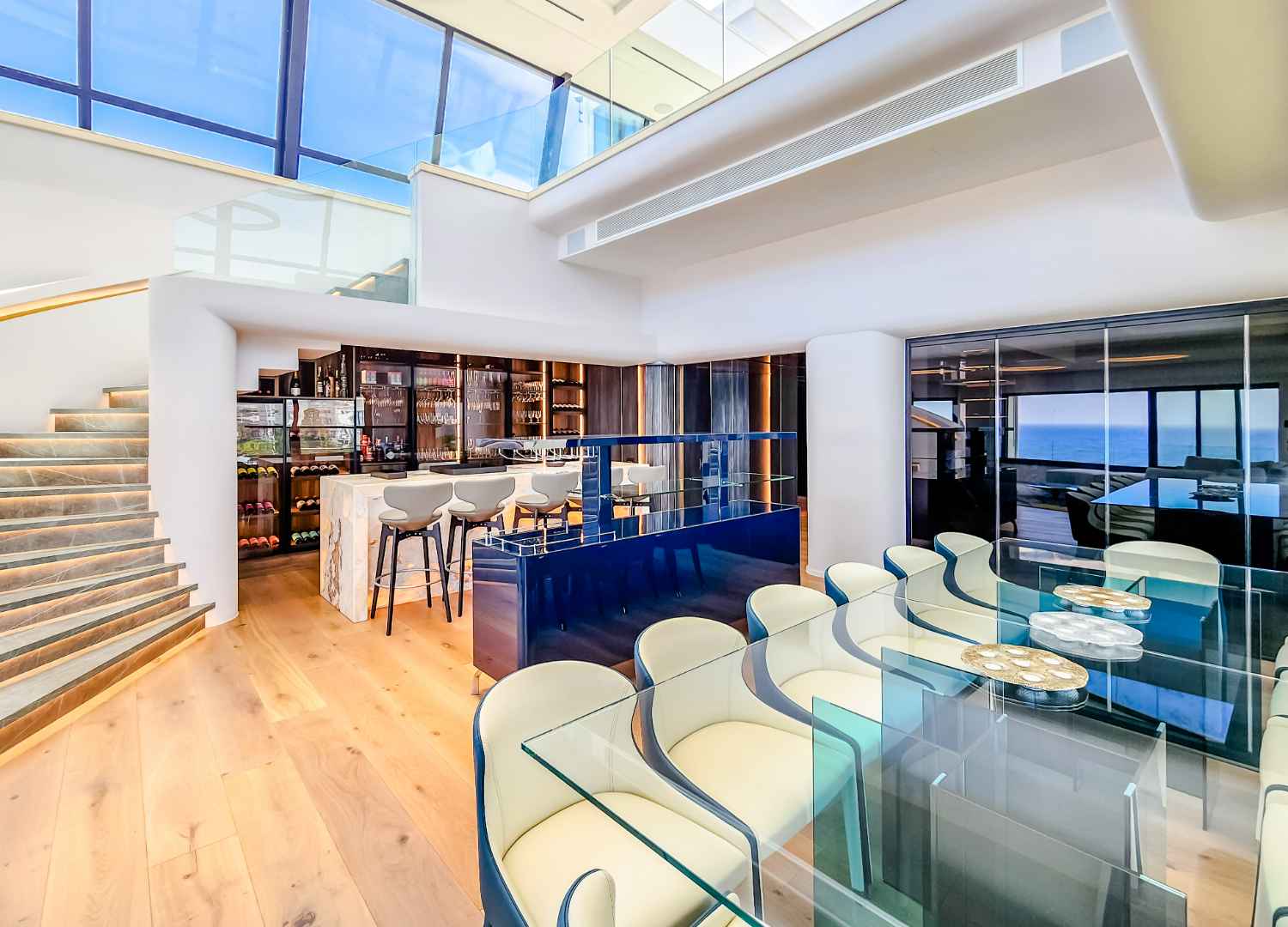 Spanning a commanding 556m2, this penthouse residence sails in rarefied waters of sophistication. From the moment you enter, soaring double-volume ceilings and a striking spiral Neolith staircase evoke the grandeur of a luxury liner’s central atrium, guiding you toward the heart of the vessel: a statement bar, formal dining quarters, and a commodore’s lounge—all bathed in unbroken panoramic views of the open sea through every sweeping glass facades that mimic the curve of a ship’s hull, immersing you in the blue.