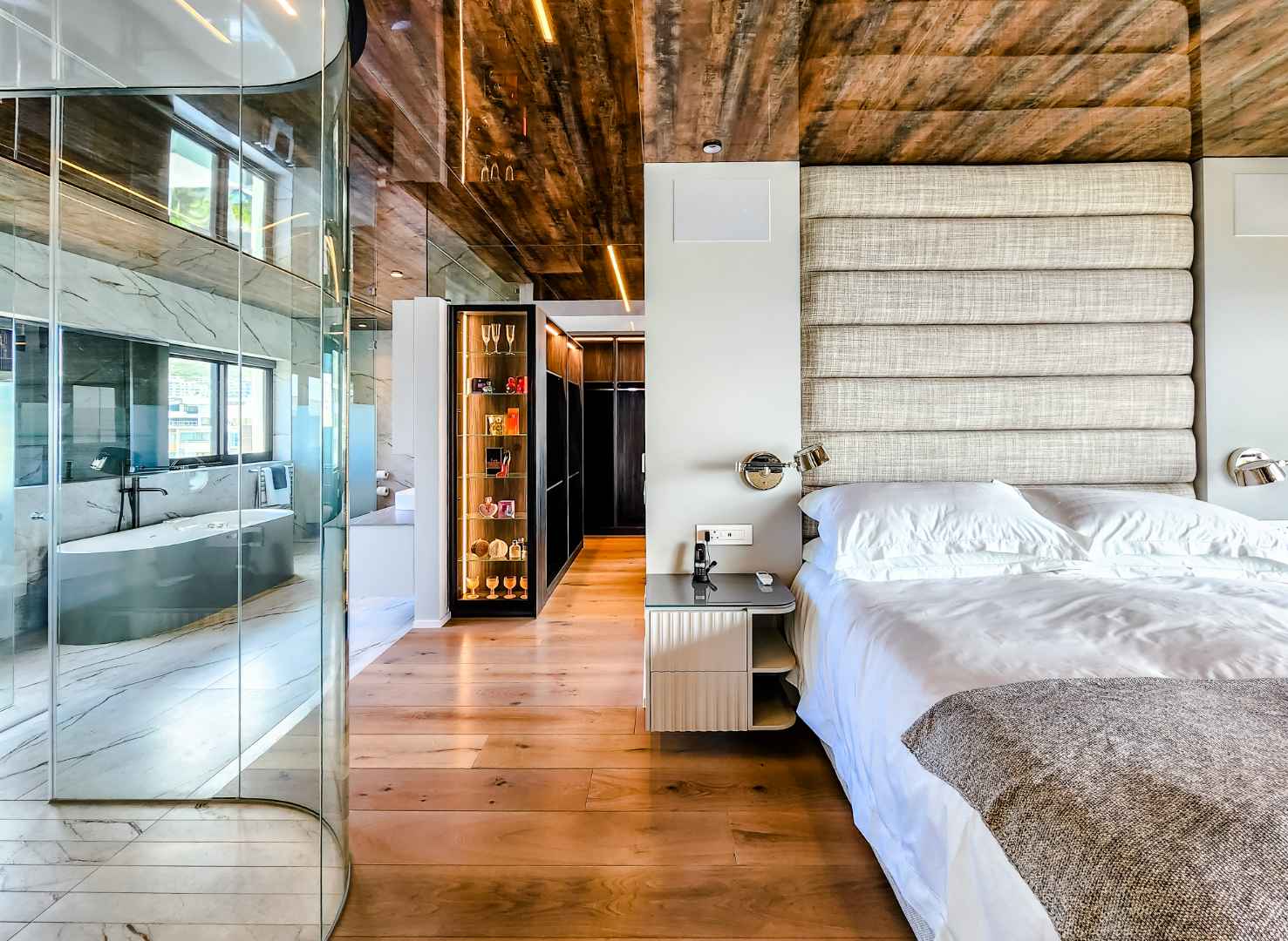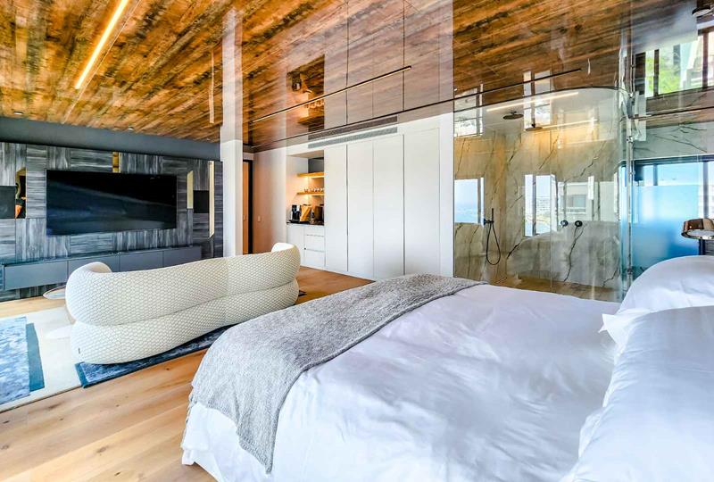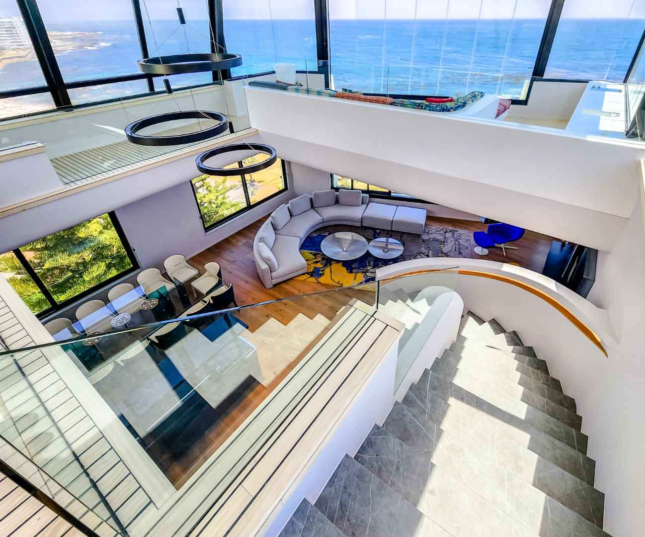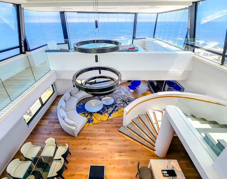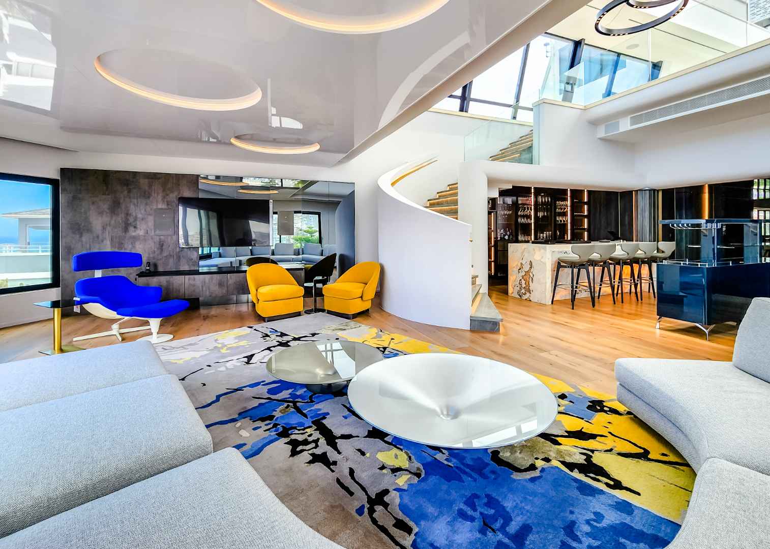 Spanning a commanding 556m2, this penthouse residence sails in rarefied waters of sophistication. From the moment you enter, soaring double-volume ceilings and a striking spiral Neolith staircase evoke the grandeur of a luxury liner’s central atrium, guiding you toward the heart of the vessel: a statement bar, formal dining quarters, and a commodore’s lounge—all bathed in unbroken panoramic views of the open sea through every sweeping glass facades that mimic the curve of a ship’s hull, immersing you in the blue.