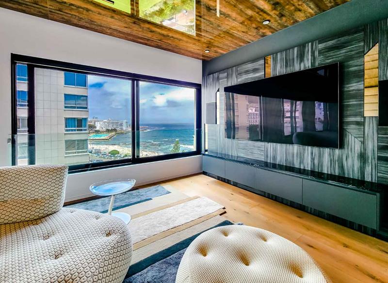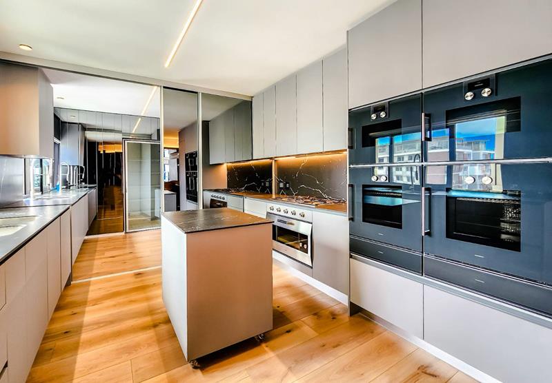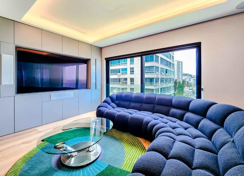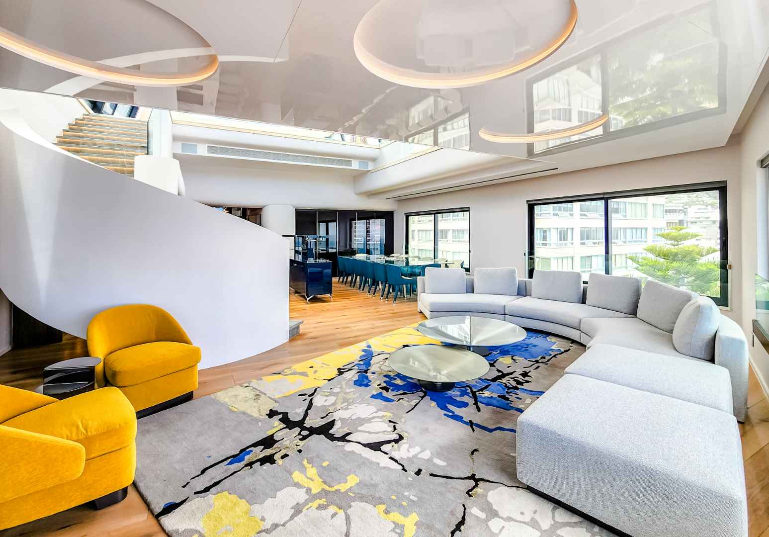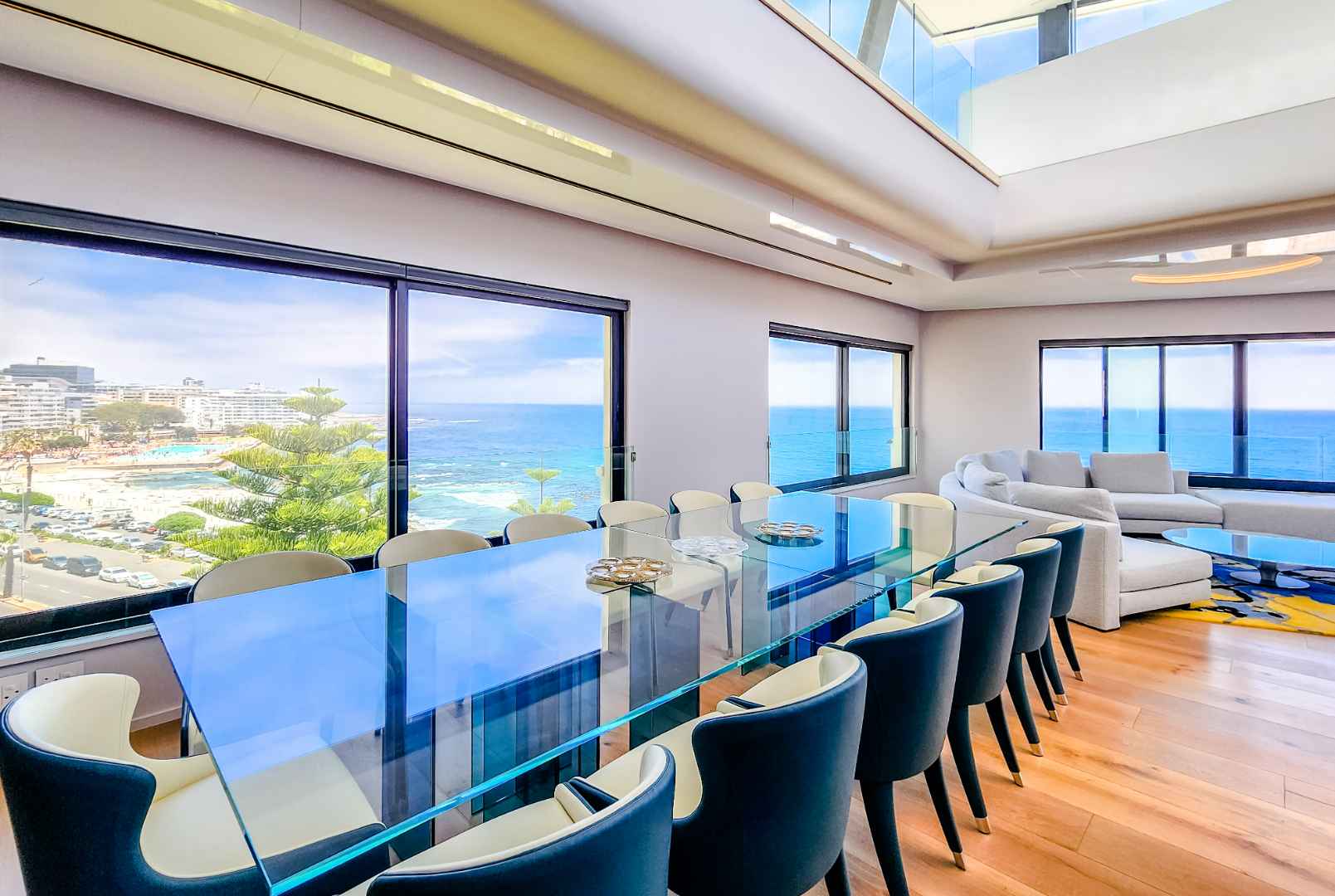 Spanning a commanding 556m2, this penthouse residence sails in rarefied waters of sophistication. From the moment you enter, soaring double-volume ceilings and a striking spiral Neolith staircase evoke the grandeur of a luxury liner’s central atrium, guiding you toward the heart of the vessel: a statement bar, formal dining quarters, and a commodore’s lounge—all bathed in unbroken panoramic views of the open sea through every sweeping glass facades that mimic the curve of a ship’s hull, immersing you in the blue.
