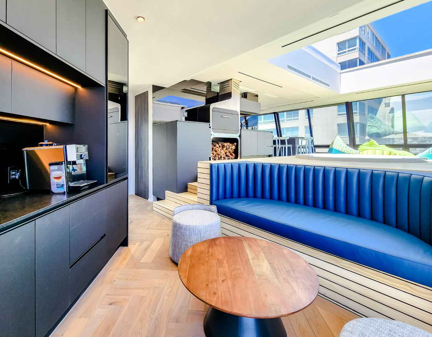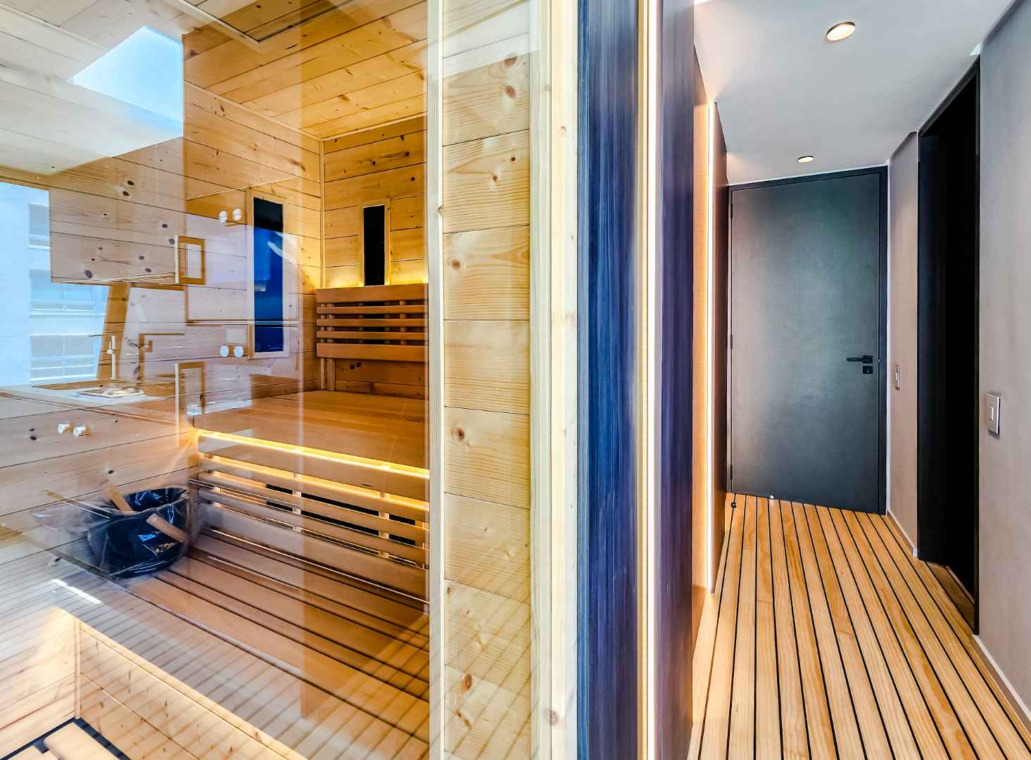 The swimming pool and jacuzzi area are immersed in a Norwegian pine deck, and equipped with an indoor BBQ, complete with a second kitchen. A ceiling-mounted, motorized large-format television screen transforms this oasis into a cinematic haven under the stars. Furthermore, there is a cedar-lined Sauna, and a full change room with poolside facilities, ready to entertain your crew and guests in unparalleled style.