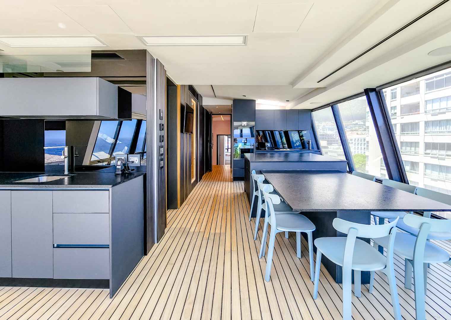 The galley (kitchen) is a chef’s dream—outfitted with world-class Gaggenau equipment, a provisions pantry, scullery, and walk-in cold room—all designed to withstand the most discerning culinary voyages.