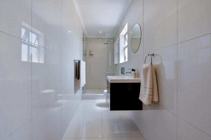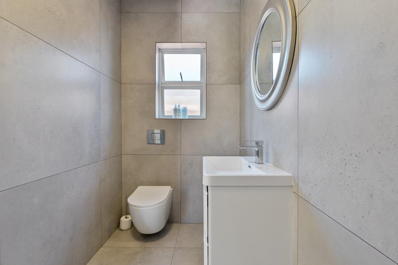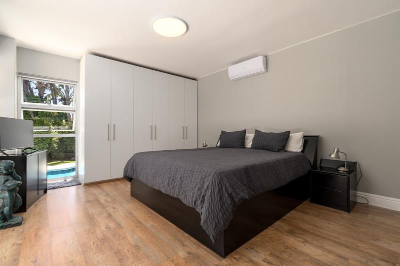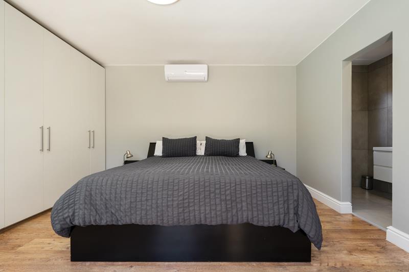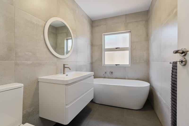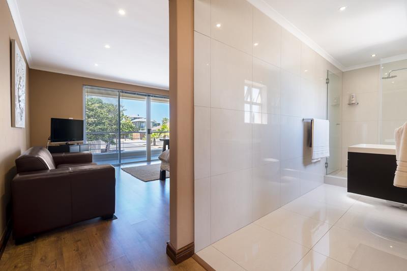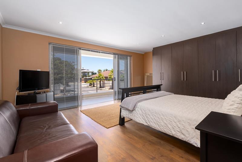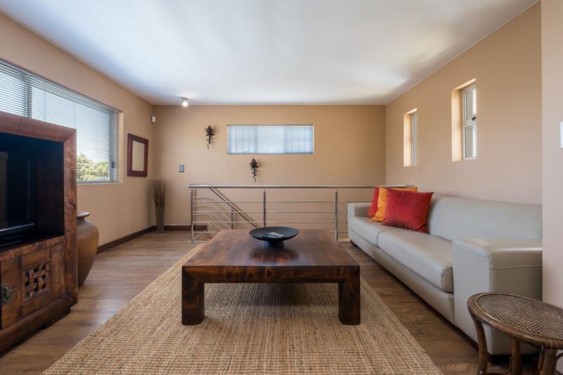 The lower level of the home boasts three bedrooms. The spacious main bedroom includes an en-suite bathroom, while a family bathroom with a freestanding bath serves the other two bedrooms. Ascending the modern meranti and steel staircase to the upper level reveals an ultra-spacious master bedroom with a large en-suite bathroom, its own balcony, and a private lounge area with views of Blouberg Hills.