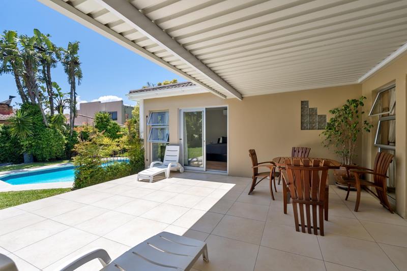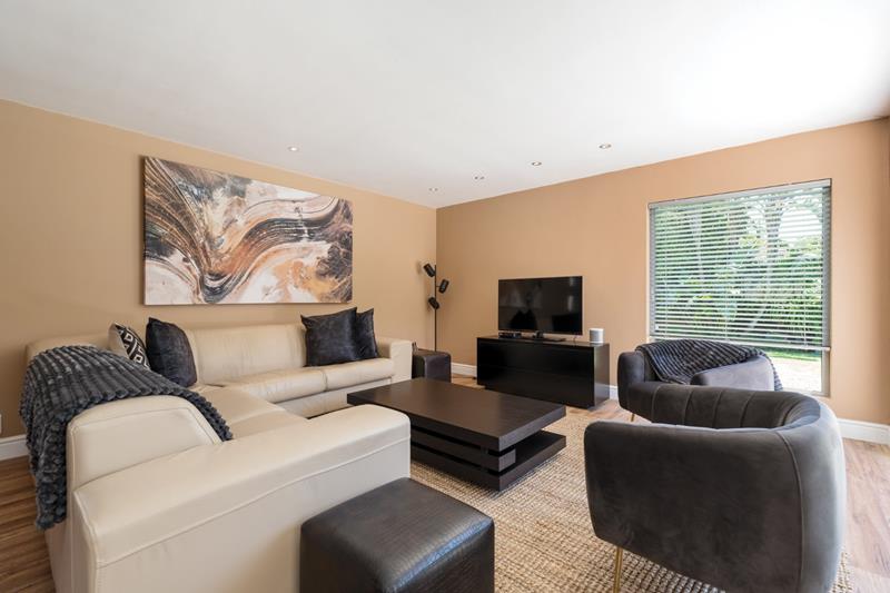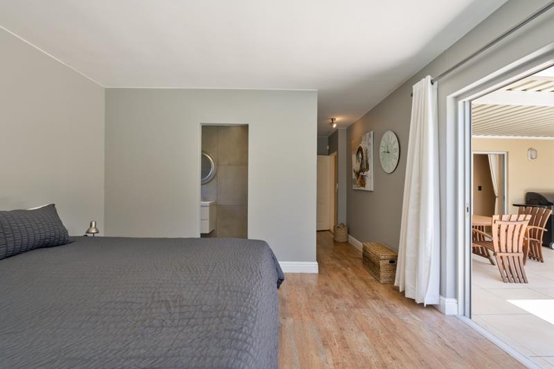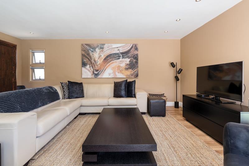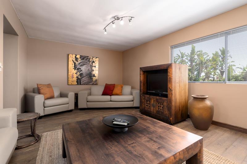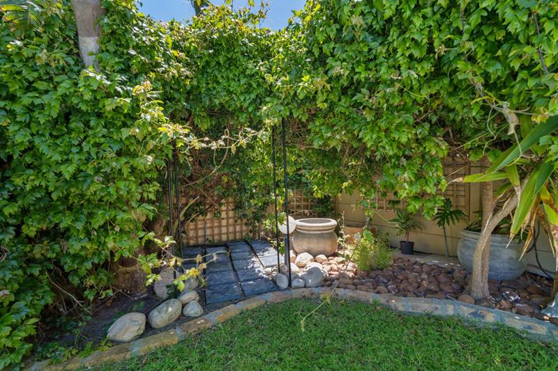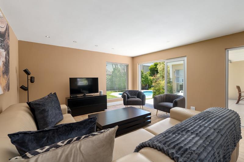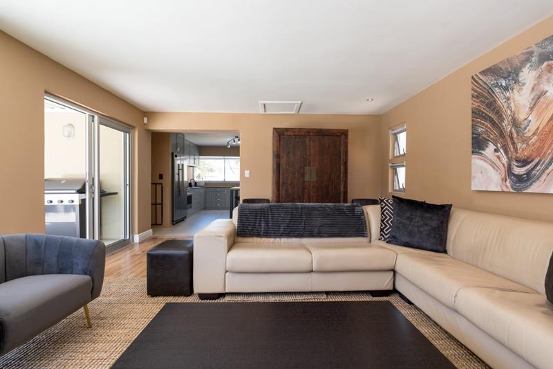 The large, light-filled lounge area flows effortlessly from the kitchen, offering views of a lush, Meticulously landscaped garden and a sparkling pool with water feature. Thanks to a fully automated irrigation system connected to a borehole, the garden and pool require minimal maintenance.