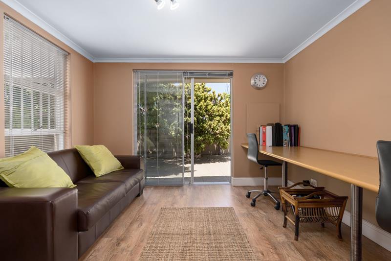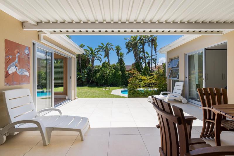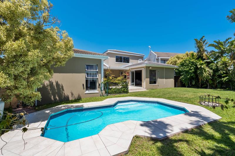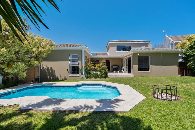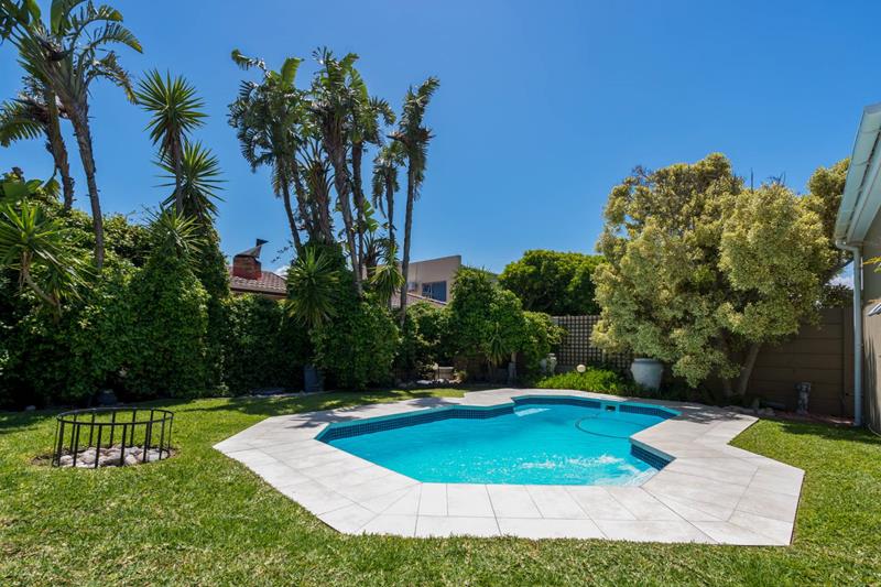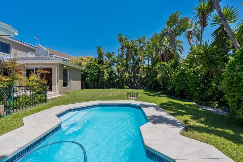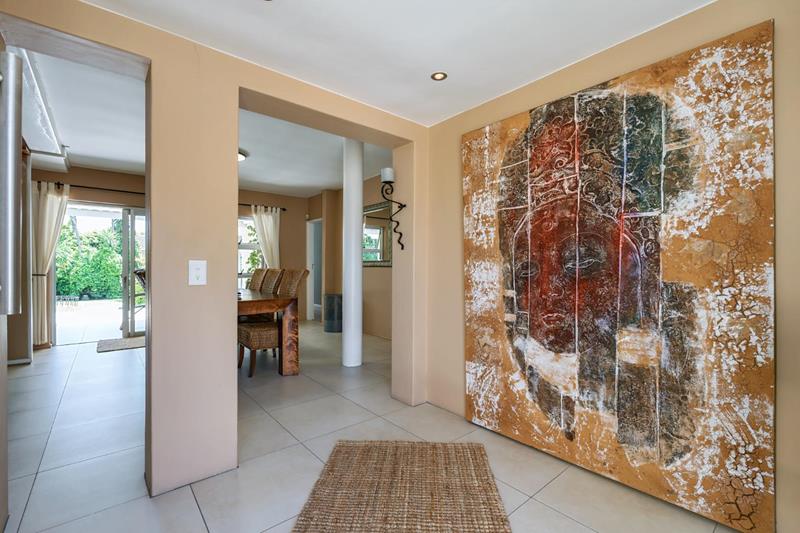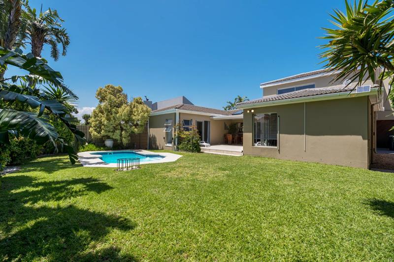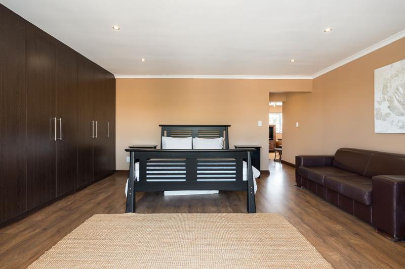 The large, light-filled lounge area flows effortlessly from the kitchen, offering views of a lush, Meticulously landscaped garden and a sparkling pool with water feature. Thanks to a fully automated irrigation system connected to a borehole, the garden and pool require minimal maintenance.
