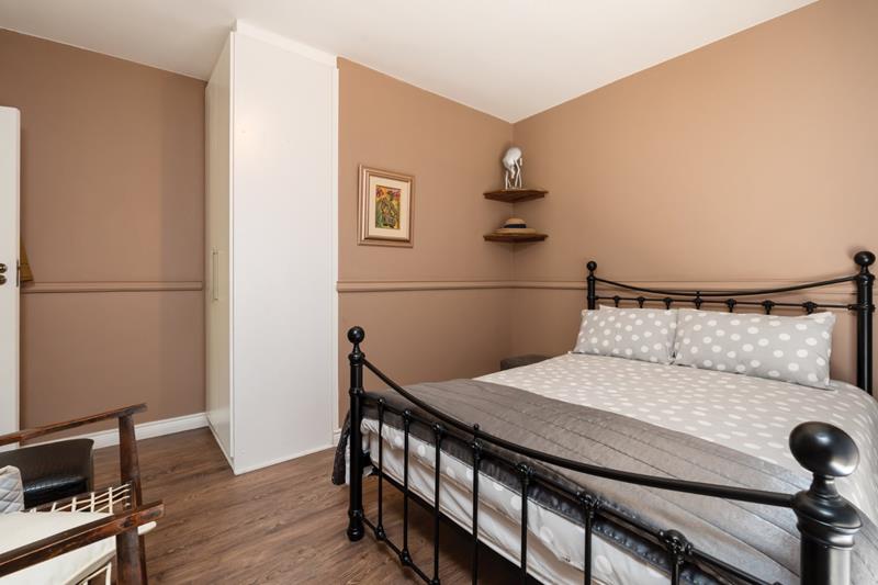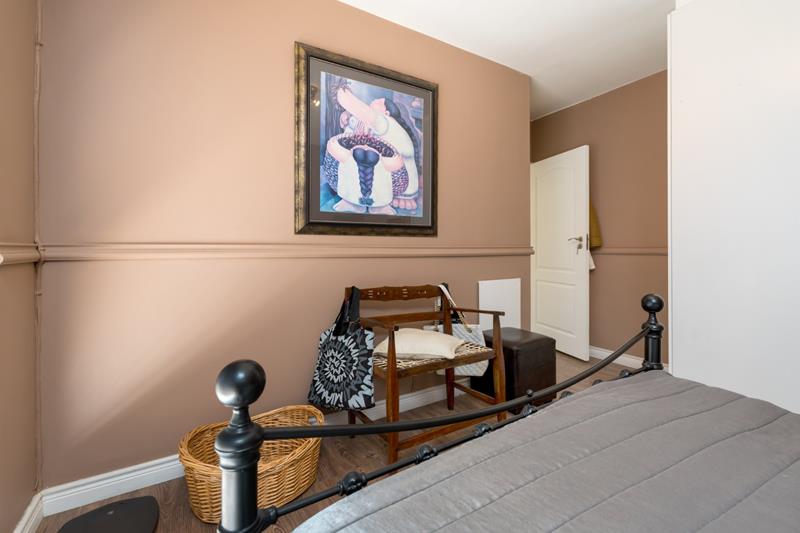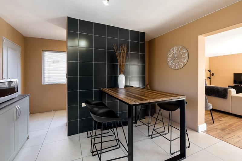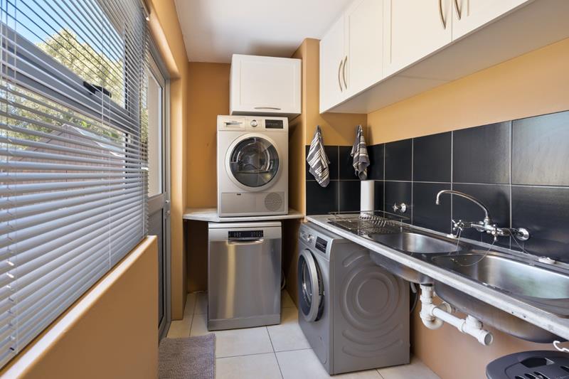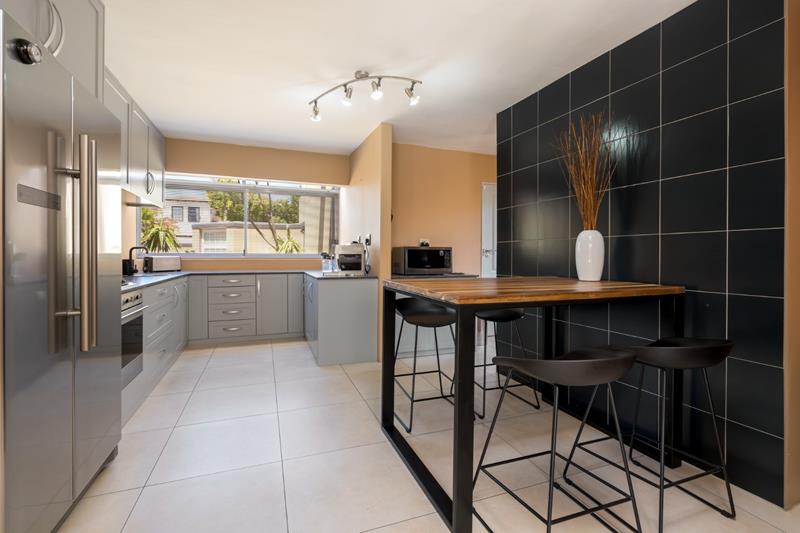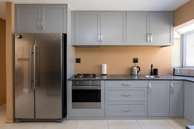 The kitchen is both stylish and functional, featuring quartz countertops, a new SMEG gas hob, and an electric oven that can be linked to an inverter during loadshedding. Adjacent to the kitchen is a separate scullery with ample space for a dishwasher, washing machine, and other appliances.