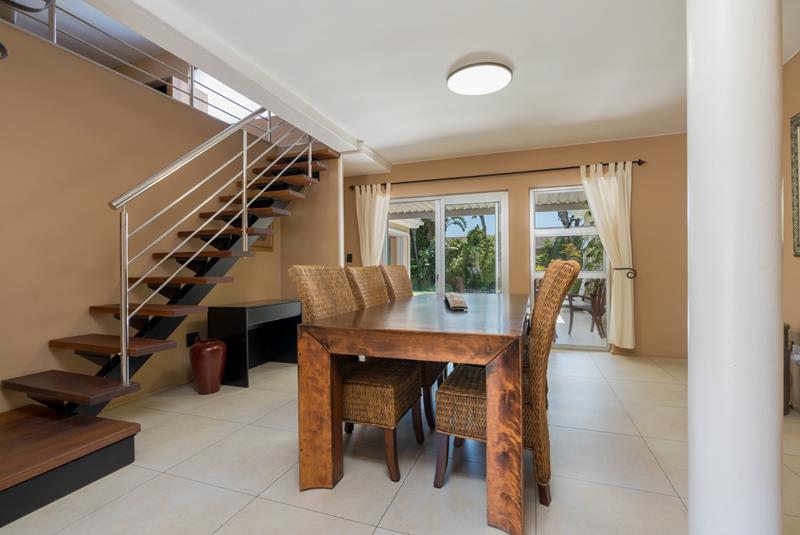 Upon entering through the private, fully enclosed, paved front courtyard, you're welcomed by an inviting entrance lobby. This leads into a spacious dining area with direct access to the north-facing garden and pool areas, perfect for gatherings and relaxation.